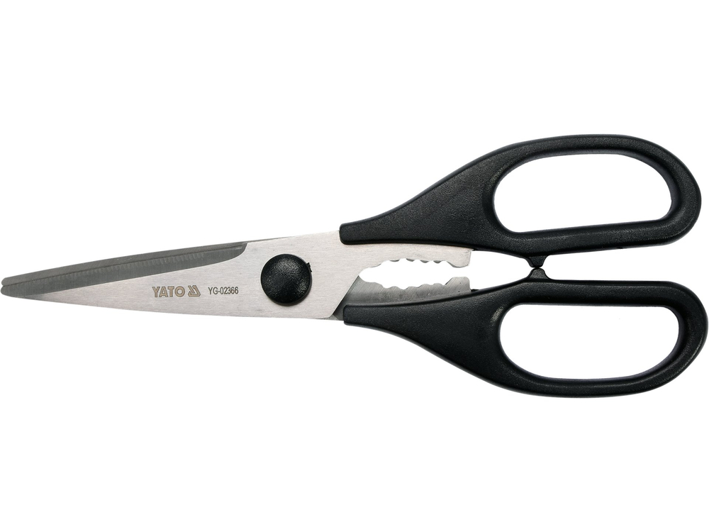 Uniwersalne nożyczki kuchenne. Nożyczki wykonane są z wysokiej jakości stali nierdzewnej 2CR13, która dzięki swojej twardości jest często wykorzystywana w produkcji ostrzy. Zapewnia bardzo długą żywotność i doskonałe parametry pracy. Ostrze o długości 70mm i grubości aż 3,0mm, posiada dodatkowo ząbkowaną krawędź gwarantującą precyzję cięcia. Nożyczki szczególnie polecane do zastosowania w gastronomi. Posiadają rozkładane ostrza, dzięki czemu istnieje możliwość dokładnego ich umycia, nawet w najtrudniej dostępnych miejscach. Dodatkowo nożyczki YATO wyposażone są w dziadek do orzechów. Ergonomiczne i bardzo wygodne rękojeści zwiększają komfort pracy. Są także przeznaczone do użytkowania przez osoby leworęczne. Nożyczki mają długość całkowitą 210mm.