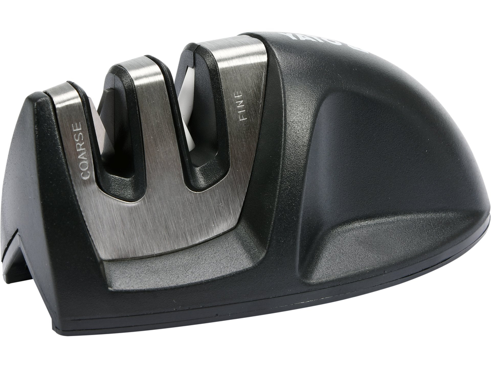 Kompaktowa ostrzałka do noży stalowych. Kompaktowa ostrzałka do noży metalowych gładkich. Wyposażona w dwa rodzaje ostrzy: - węglik wolframu - do ostrzenia wstępnego noży stalowych - ceramiczne - do ostrzenia końcowego. Korpus wykonany z mocnego i wytrzymałego materiału ABS. Wygodny uchwyt oraz antypoślizgowa podstawka zapewniają komfortowe i bezpieczne użytkowanie. Do ostrzenia noży stalowych