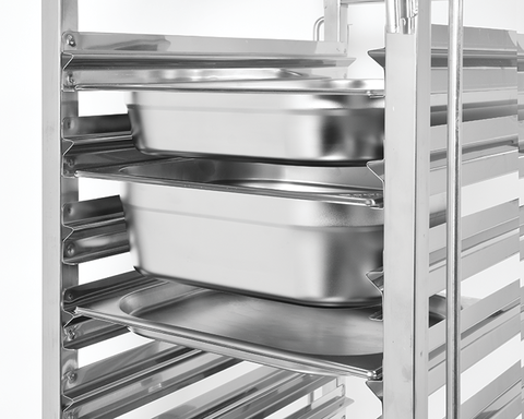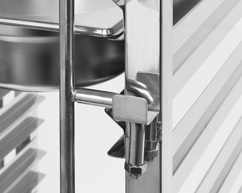 Wózek wykonany jest z wysokiej jakości stali nierdzewnej typu 201. Gwarantuje to odporność na rdzę i zapewnia wysokie walory użytkowania oraz łatwość utrzymania w czystości. Dzięki solidnej konstrukcji z profili o grubości 0,9 mm, wózek transportowy jest niezwykle stabilny a każda z półek wytrzymuje obciążenie do 40 kg. Rozmieszczone co 80 mm prowadnice o specjalnej konstrukcji w kształcie litery M, gwarantują stabilne utrzymanie pojemników GN. Profil tego typu daje możliwość dodatkowego dostosowania odległości pomiędzy poszczególnymi poziomami o 20 mm. Po obu stronach wózka znajdują się specjalne, proste w obsłudze blokady, zabezpieczające pojemniki przed wysunięciem podczas transportu.