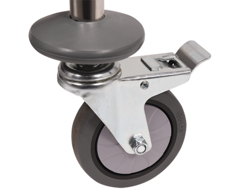 Wózek wyposażony jest w 4 kółka z łożyskami, wykonane z wysokiej jakości szarego TPR. Zastosowanie twardego, a jednocześnie elastycznego materiału zapewnia bardzo cichą pracę. Kółka nie rysują posadzki, nie pozostawiają na niej śladów i są skrętne w zakresie 360°. Umożliwia to manewrowanie w trudno dostępnych pomieszczeniach i wąskich korytarzach. 2 kółka wyposażono dodatkowo w hamulce.