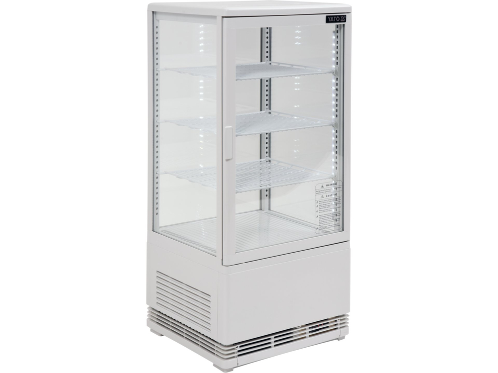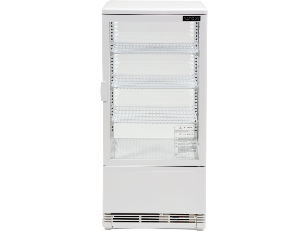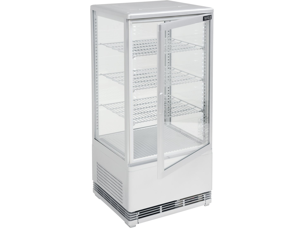 Witryna chłodnicza YATO wolnostojąca o pojemności 78L w kolorze białym o wymiarze 428x386x960mm. Witryna chłodnicza marki YATO przeznaczona jest do ekspozycji ciast, tortów, koktajli, jogurtów czy różnego rodzaju napojów orzeźwiających, a także sałatek czy drobnych przekąsek. Nowoczesne wzornictwo połączone z wysoką jakością surowców powoduję, że witryna chłodnicza YATO doskonale prezentuje się na froncie we wszelkiego typu cukierniach, kawiarniach, restauracjach, barach czy punktach handlowych. Dodatkowo zainstalowane oświetlenie LED z dwóch stron eksponuje prezentowane potrawy w bardzo atrakcyjny sposób zachęcając klientów do ich wyboru. Witryna chłodnicza YATO ma pojemność 78L i posiada trzy wzmacniane i powlekane ochronnym PVC półki w rozmiarze 357x310 mm o regulowanej wysokości mocowania. Dostęp do nich odbywa się za pośrednictwem otwieranych drzwiczek szklanych. Wykonane są one z dwuwarstwowych szyb hartowanych, podobnie jak szyba frontowa i boczne. Zapewnia to dużą wytrzymałość, a jednocześnie bardzo dobre właściwości izolujące. Witryna pracuje w zakresie temperatur 0~ +12°C wykorzystując czynnik chłodniczy R600a. Natomiast zastosowana technologia chłodzenia wymuszonego oraz funkcja automatycznego rozmrażania zapewniają bardzo efektywną pracę, a jednocześnie są energooszczędne. Ponad to chłodzenie wymuszone gwarantuje równomierne rozprowadzenie powietrza wewnątrz całej witryny zapewniając równą temperaturę na każdej półce. Średnie roczne zużycie energii wynosi 1003 kWh. Sterowanie witryną odbywa się za pomocą sterownika elektronicznego z wyświetlaczem temperatury. Kawiarnie, cukiernie, hotele, restauracje, bary, punkty handlowe, sklepy spożywcze