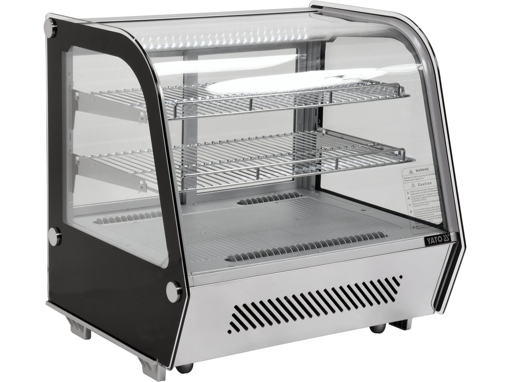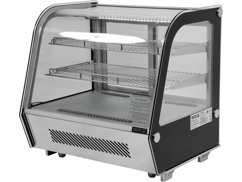 Witryna chłodnicza YATO nastawna o pojemności 120L w kolorze srebrnym. Witryna chłodnicza marki YATO przeznaczona jest do ekspozycji ciast, tortów, koktajli czy różnego rodzaju napojów. Nowoczesne wzornictwo połączone z wysoką jakością surowców powoduję, że witryna chłodnicza YATO doskonale prezentuje się na froncie we wszelkiego typu cukierniach, kawiarniach, restauracjach czy punktach handlowych. Dodatkowo zainstalowane oświetlenie LED eksponuje prezentowane potrawy w bardzo atrakcyjny sposób zachęcając klientów do ich wyboru. Nadstawka chłodnicza YATO ma pojemność 120L i posiada dwie chromowane półki o regulowanej wysokości. Dostęp do nich odbywa się za pośrednictwem przesuwanych drzwiczek szklanych. Wykonane są one ze szkła hartowanego, podobnie jak panoramiczna zaokrąglona szyba przednia. Zapewnia to dużą wytrzymałość, a jednocześnie bardzo dobre właściwości izolujące. Witryna pracuje w zakresie temperatur 0~ +12°C wykorzystując czynnik chłodniczy R600a. Natomiast zastosowana technologia chłodzenia statycznego z górną dyszą parową oraz funkcją automatycznego rozmrażania zapewnia bardzo efektywną pracę, a jednocześnie jest energooszczędna. Średnie roczne zużycie energii wynosi 1141 kWh. Sterowanie nadstawką odbywa się za pomocą sterownika elektronicznego z wyświetlaczem temperatury.