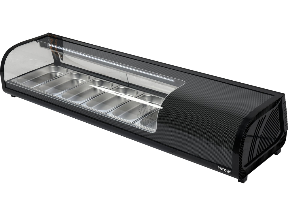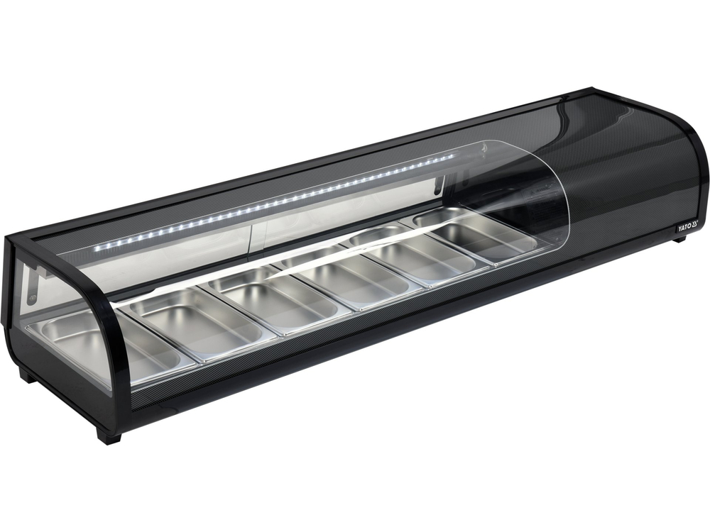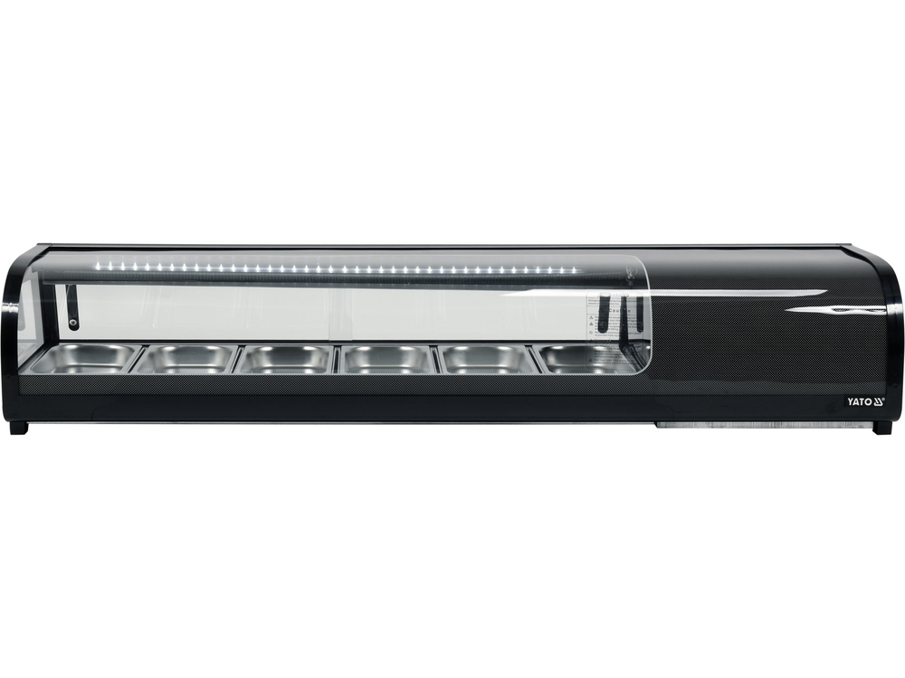 Witryna chłodnicza YATO do sushi 6x1/3GN. Witryna chłodnicza marki YATO przeznaczona jest do ekspozycji sushi, tapas czy różnego rodzaju starterów. Nowoczesne wzornictwo połączone z wysoką jakością surowców powoduję, że witryna chłodnicza YATO doskonale prezentuje się na froncie we wszelkiego typu restauracjach czy hotelach. Dodatkowo zainstalowane oświetlenie LED eksponuje prezentowane potrawy w bardzo atrakcyjny sposób zachęcając klientów do ich wyboru.