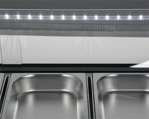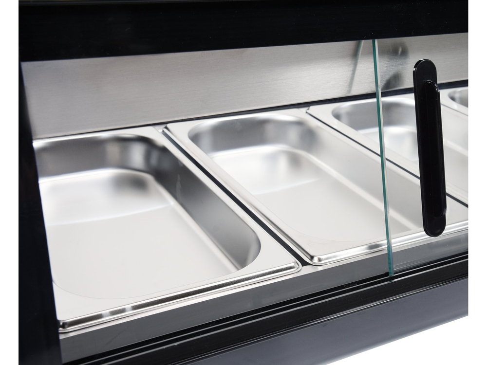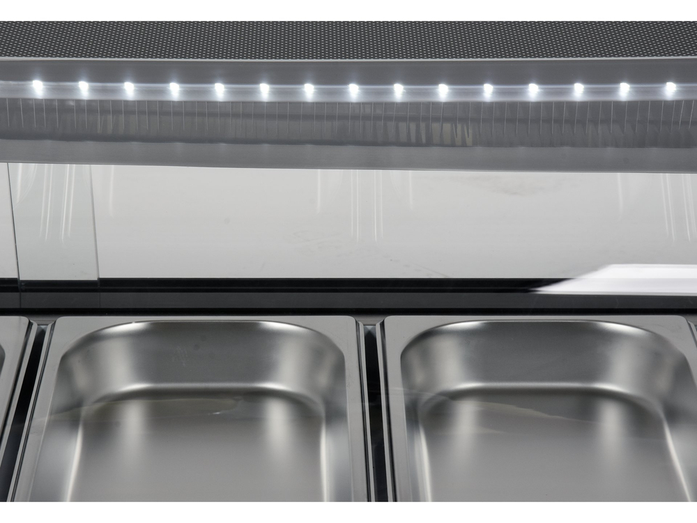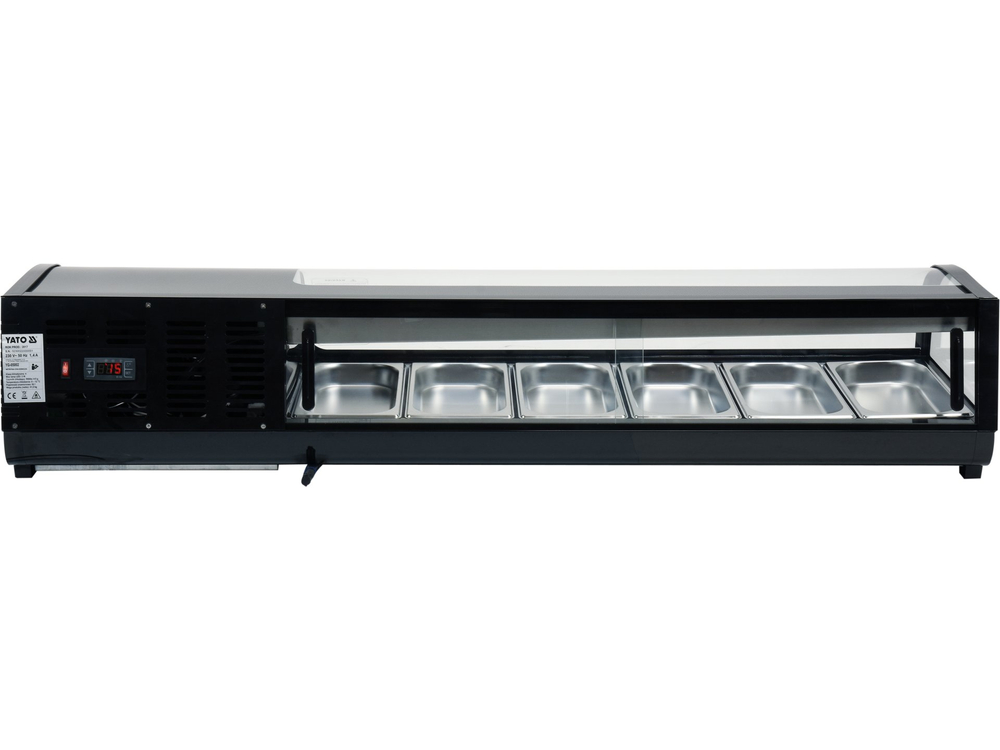 Nadstawka chłodnicza YATO mieści 6 pojemników GN 1/3 40 mm ze stali nierdzewnej, które są zawarte w zestawie. Dostęp do nich odbywa się za pośrednictwem przesuwanych drzwiczek szklanych. Wykonane są one ze szkła hartowanego, podobnie jak panoramiczna zaokrąglona szyba przednia. Zapewnia to dużą wytrzymałość, a jednocześnie bardzo dobre właściwości izolujące.