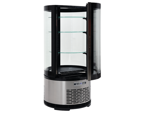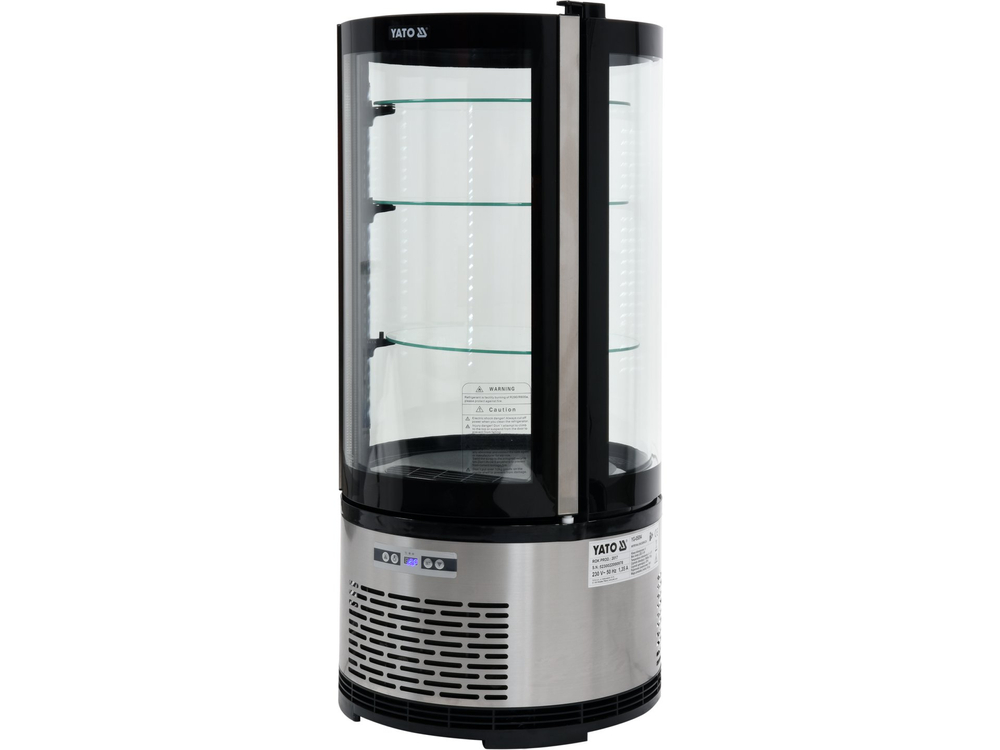 Witryna chłodnicza okrągła YATO nastawna o pojemności 100L w kolorze czarnym. Witryna chłodnicza marki YATO przeznaczona jest do ekspozycji ciast, tortów, koktajli czy różnego rodzaju napojów. Nowoczesne wzornictwo połączone z wysoką jakością surowców powoduję, że witryna chłodnicza YATO doskonale prezentuje się na froncie we wszelkiego typu cukierniach, kawiarniach, restauracjach czy punktach handlowych. Dodatkowo zainstalowane oświetlenie LED eksponuje prezentowane potrawy w bardzo atrakcyjny sposób zachęcając klientów do ich wyboru. Nadstawka chłodnicza YATO ma pojemność 100L i posiada trzy półki z hartowanego szkła o regulowanej wysokości. Dostęp do nich odbywa się za pośrednictwem otwieranych drzwiczek szklanych z funkcją samo-zamykania. Wykonane są one ze szkła hartowanego, podobnie jak zaokrąglona szyba przednia. Zapewnia to dużą wytrzymałość, a jednocześnie bardzo dobre właściwości izolujące. Witryna pracuje w zakresie temperatur +2~ +8°C wykorzystując czynnik chłodniczy R600a. Natomiast zastosowana technologia chłodzenia wymuszonego oraz funkcja automatycznego rozmrażania zapewniają bardzo efektywną pracę, a jednocześnie są energooszczędne. Średnie roczne zużycie energii wynosi 1376 kWh. Sterowanie nadstawką odbywa się za pomocą sterownika elektronicznego z wyświetlaczem temperatury.