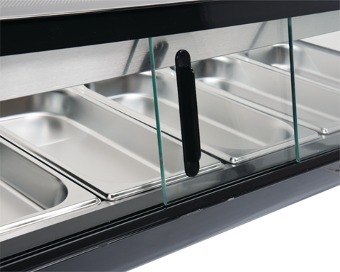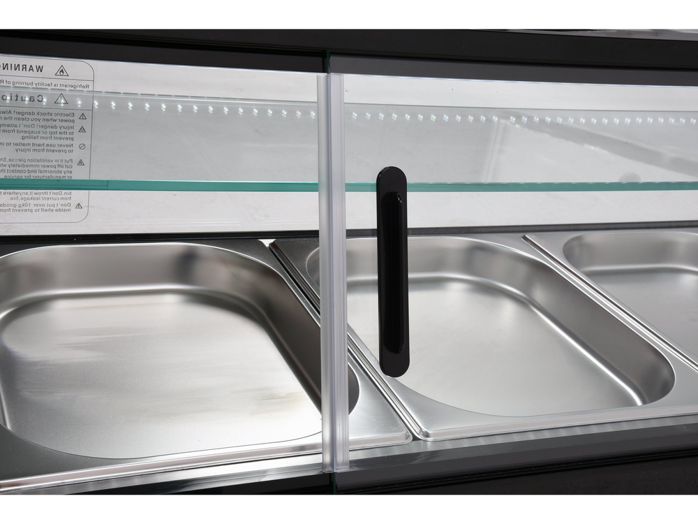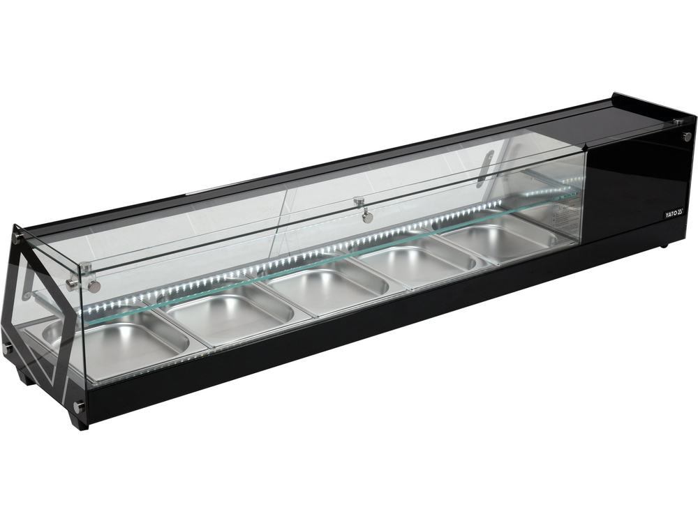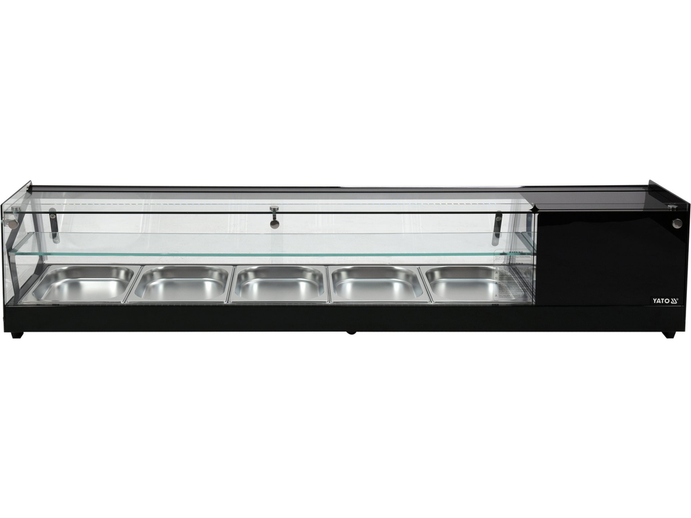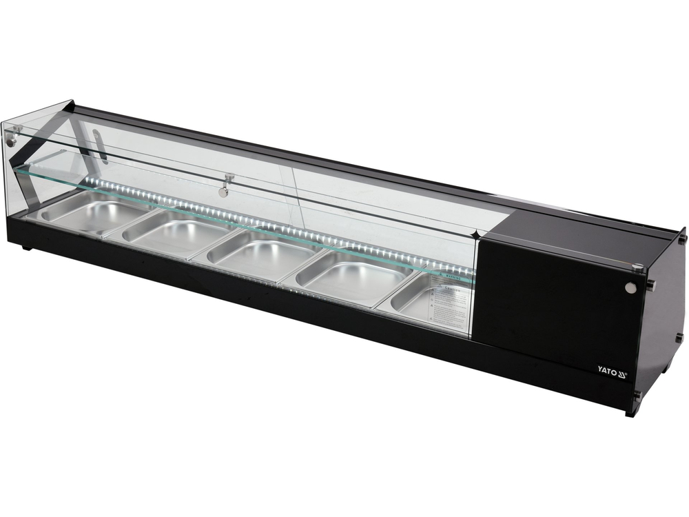 Witryna chłodnicza YATO do sushi 5x1/2GN Witryna chłodnicza marki YATO przeznaczona jest do ekspozycji sushi, tapas czy różnego rodzaju starterów. Nowoczesne wzornictwo połączone z wysoką jakością surowców powoduję, że witryna chłodnicza YATO doskonale prezentuje się na froncie we wszelkiego typu restauracjach czy hotelach. Dodatkowo zainstalowane oświetlenie LED eksponuje prezentowane potrawy w bardzo atrakcyjny sposób zachęcając klientów do ich wyboru. Nadstawka chłodnicza YATO mieści 5 pojemników GN 1/2 40 mm ze stali nierdzewnej, które są zawarte w zestawie. Dostęp do nich odbywa się za pośrednictwem przesuwanych drzwiczek szklanych. Wykonane są one ze szkła hartowanego, podobnie jak panoramiczna szyba przednia. Zapewnia to dużą wytrzymałość, a jednocześnie bardzo dobre właściwości izolujące. Witryna pracuje w zakresie temperatur 0~ +12°C wykorzystując czynnik chłodniczy R600a. Natomiast zastosowana technologia chłodzenia statycznego z górną dyszą parową oraz funkcją automatycznego rozmrażania zapewnia bardzo efektywną pracę, a jednocześnie jest energooszczędna. Średnie roczne zużycie energii wynosi 955 kWh. Sterowanie nadstawką odbywa się za pomocą sterownika elektronicznego z wyświetlaczem temperatury.