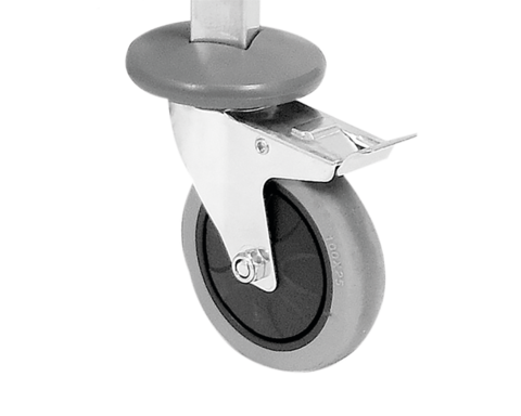 Wózek wyposażony jest w 4 kółka z łożyskami, wykonane z wysokiej jakości szarego TPR. Zastosowanie twardego, a jednocześnie elastycznego materiału zapewnia bardzo cichą pracę. Kółka nie rysują posadzki, nie pozostawiają na niej śladów i są skrętne w zakresie 360°. Umożliwia to manewrowanie w trudno dostępnych pomieszczeniach i wąskich korytarzach. Dwa kółka wyposażono dodatkowo w hamulce.