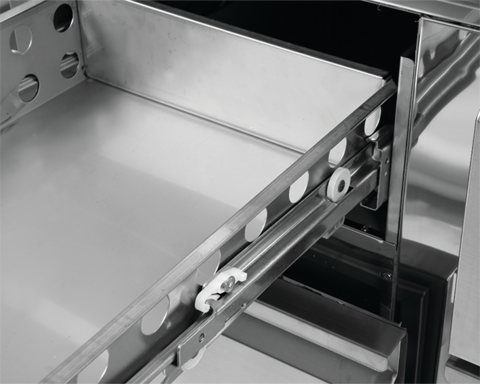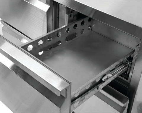 Model z 4 samozamykającymi się szufladami z wygodnymi uchwytami do otwierania. Umożliwia przechowywanie pojemników GN 1/1 oraz butelek o wysokości max 150 mm.