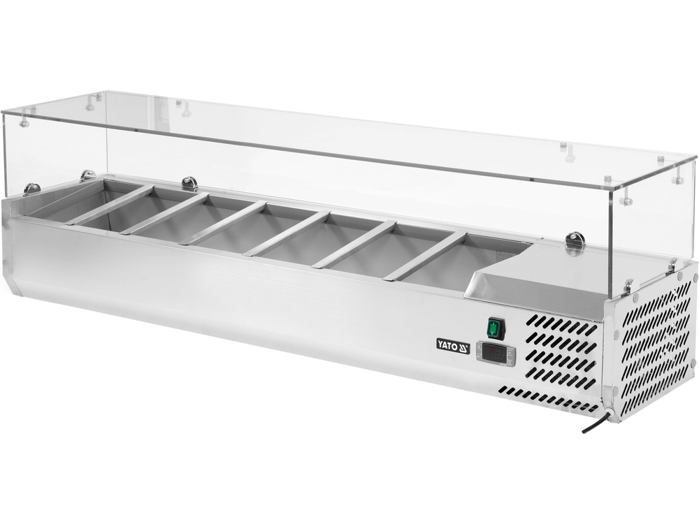 Witryna chłodnicza YATO o wymiarach 1500 x 33 5x 435 mm mieści 7 pojemników GN 1/4 o max głębokości 150 mm.