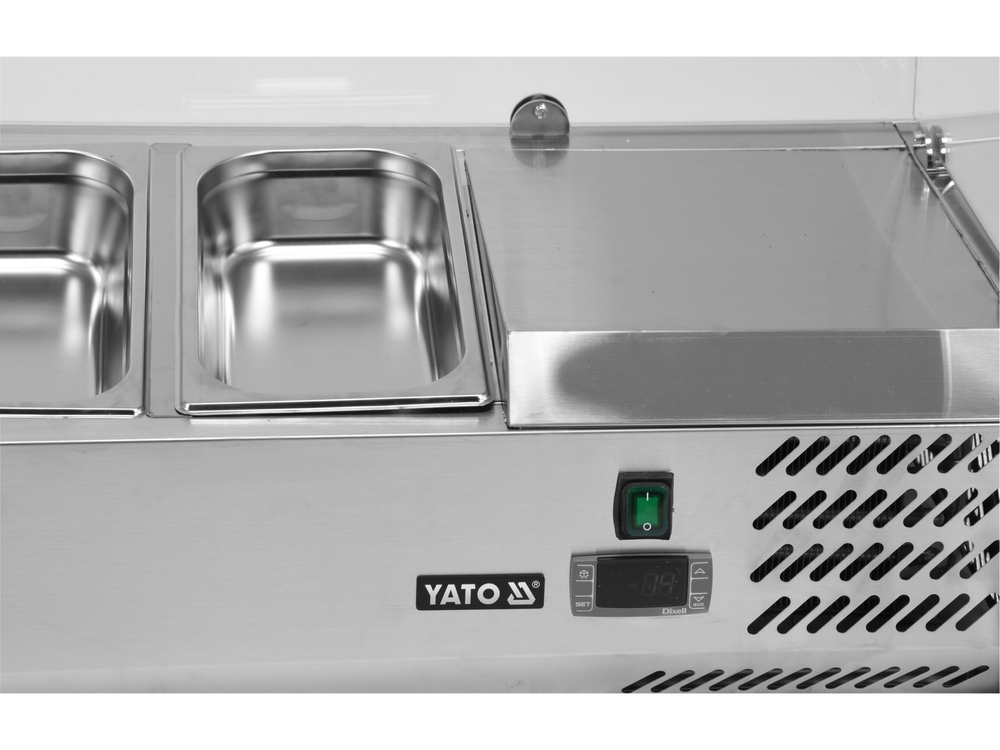 Nadstawna witryna chłodnicza marki YATO utrzymuje właściwą temperaturę przechowywanych składników do przygotowywania potraw: pizzy, sałatek, kanapek, itp. Natomiast nowoczesne wzornictwo połączone z wysoką jakością surowców powoduję, że witryna chłodnicza YATO doskonale prezentuje się na froncie we wszelkiego typu restauracjach, pizzeriach, barach czy hotelach.