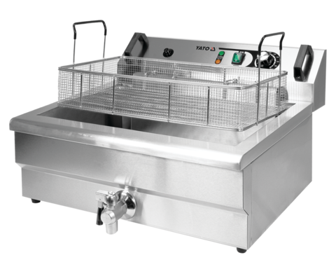 Smażalnik YATO posiada bardzo wytrzymały kosz o wymiarze 490x280x100mm z bocznymi uchwytami. Natomiast specjalne zaczepy umożliwiają powieszenie kosza bezpośrednio nad zbiornikiem, minimalizując ryzyko zachlapania olejem blatu roboczego. Dzięki temu znacznie zwiększa się czystość stanowiska pracy i minimalizuje czas potrzebny na czyszczenie. Dodatkowo smażalnik posiada boczny ociekacz, na którym można odstawić do ostygnięcia i ocieknięcia usmażone produkty.