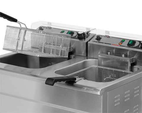 Dwie grzałki o mocy 5,0kW każda, sterowane są za pomocą potencjometrów umieszczonych na panelu sterującym. Możliwe jest ustawienie temperatury pracy w zakresie 60~200℃. Zainstalowane bryzgoszczelne wyłączniki pozwala na wyłączenie urządzenia, bez konieczności odłączania kabla zasilającego z sieci. Dodatkowo panel sterujący posiada osłonę zabezpieczającą wykonaną z bardzo wytrzymałego poliwęglanu, która chroni panel przed zachlapaniem olejem podczas smażenia. Dzięki temu utrzymanie frytownicy w czystości jest znacznie ułatwione. Wyjmowane grzałki mają możliwość powieszenia ich na specjalnych uchwytach w pozycji, w której ściekający olej trafia z powrtotem do zbiornika. Frytownica posiada dodatkowe zbezpieczenie, które automatycznie wyłącza grzałkę w momencie wyciągnięcia jej ze zbiornika. Dodatkowe zabezpieczenie chroni ją przed przegrzaniem, przy temperaturze powyżej 260℃.