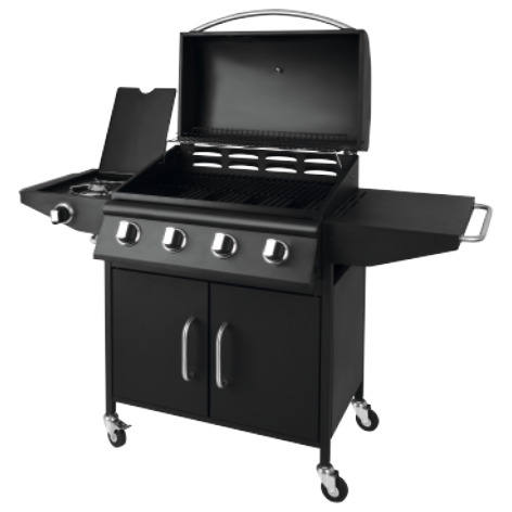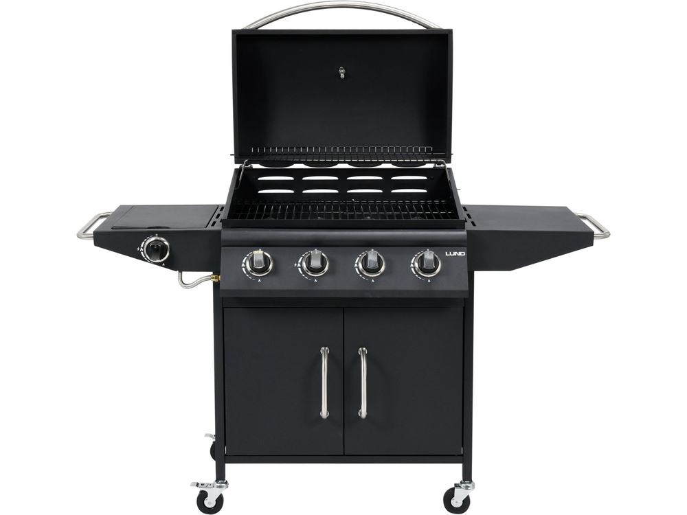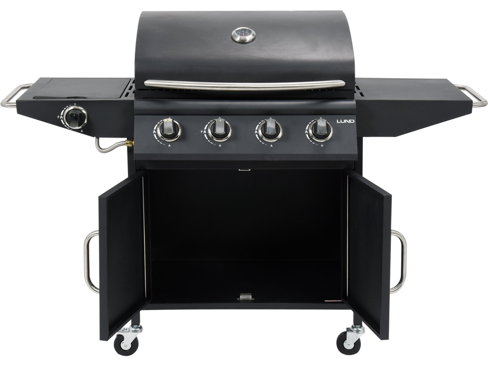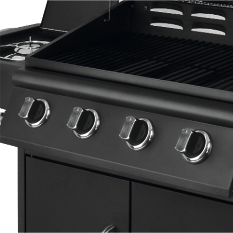 Profesjonalny grill gazowy 4+1 do przygotowywania potraw na świeżym powietrzu, z wygodną regulacją pozwalającą na idealne wypieczenie potraw. Wyposażony w 4 palniki główne i 1boczny o łącznej mocy 16kW. Półki boczne oraz pojemna, zamykana szafka ułatwią przechowywanie przypraw i niezbędnych akcesoriów