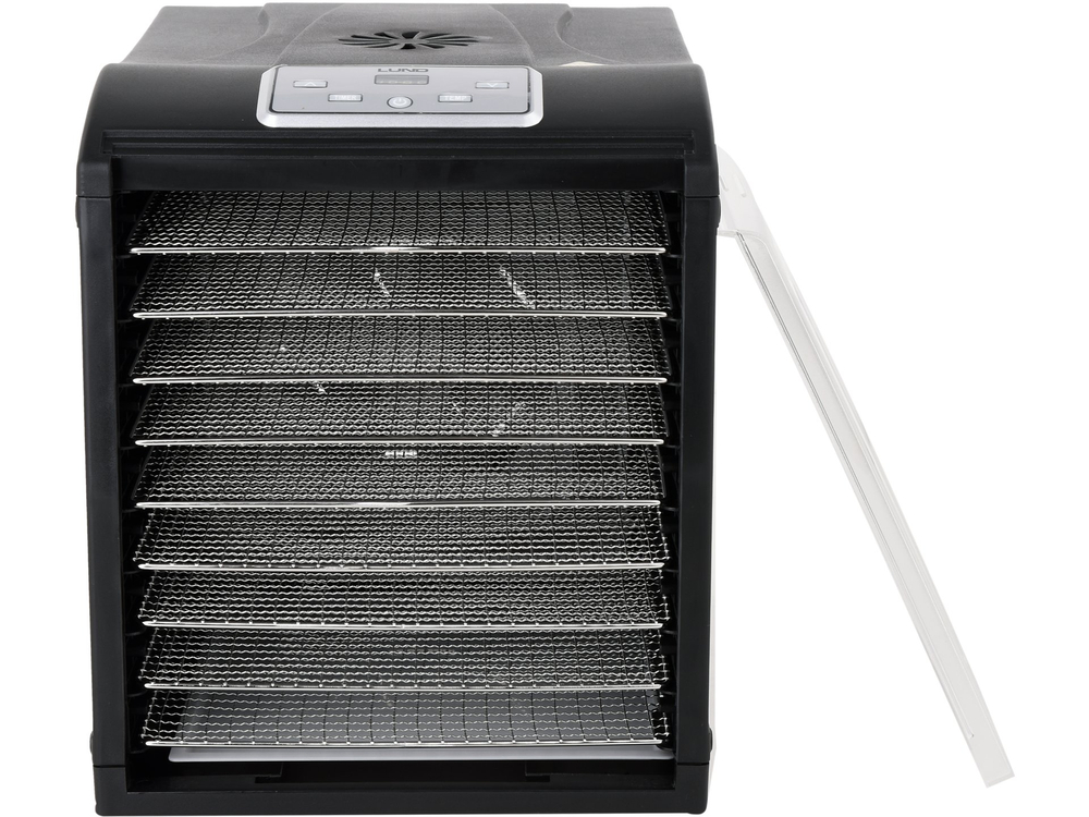 - Dodatkowe akcesoria – siatka i tacka – idealne do suszenia małych produktów, takich jak zioła czy herbata
