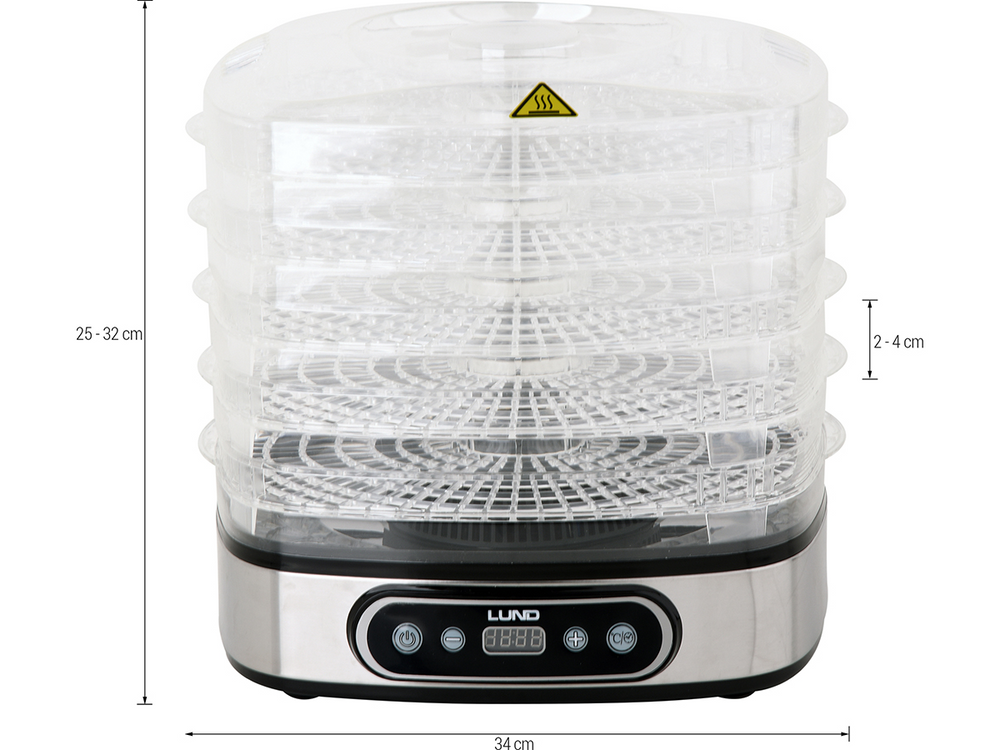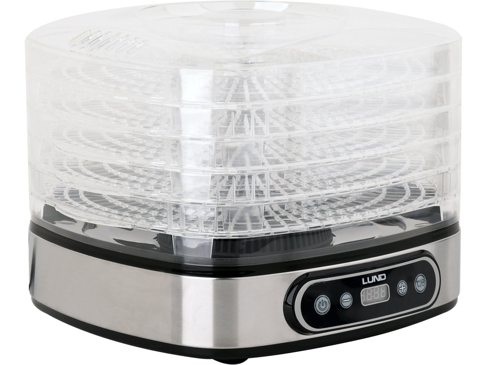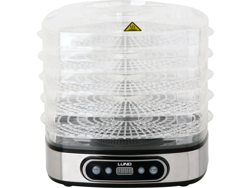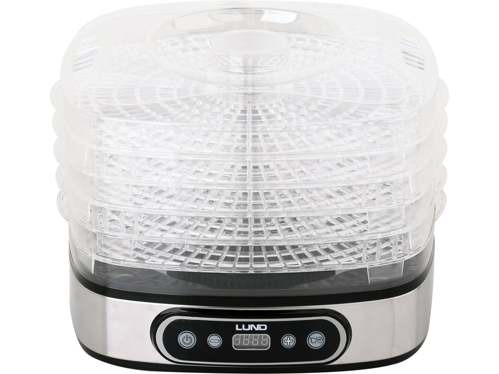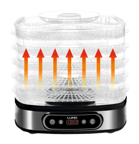 Suszarka elektryczna LUND przeznaczona do suszenia produktów spożywczych: owoców, warzyw, grzybów, kwiatów, ziół, mięs i ryb. Pozwala zachować wartości odżywcze i smakowe żywności, konserwując ją na okres kilku miesięcy. Dzięki wbudowywanemu czasomierzowi, istnieje możliwość zaprogramowania suszenia między 0,5 a 19,5 godziny.