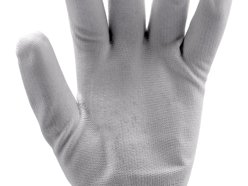 Rękawice robocze ochronne wykonane z białego nylonu, powlekane w części chwytnej białym poliuretanem. Grubsza niż zazwyczaj warstwa powlekania oraz wysoka jakość poliuretanu zapewniają najwyższą według normy EN 388 odporność na ścieranie. Bezszwowa konstrukcja z wysokiej jakości nylonu to podwyższona odporność na rozdzieranie oraz zachowanie elastyczności przez dłuższy czas. Drobny ścieg 15G, czyli 15 oczek na cal, to niższa waga i jeszcze lepsze przyleganie do dłoni.