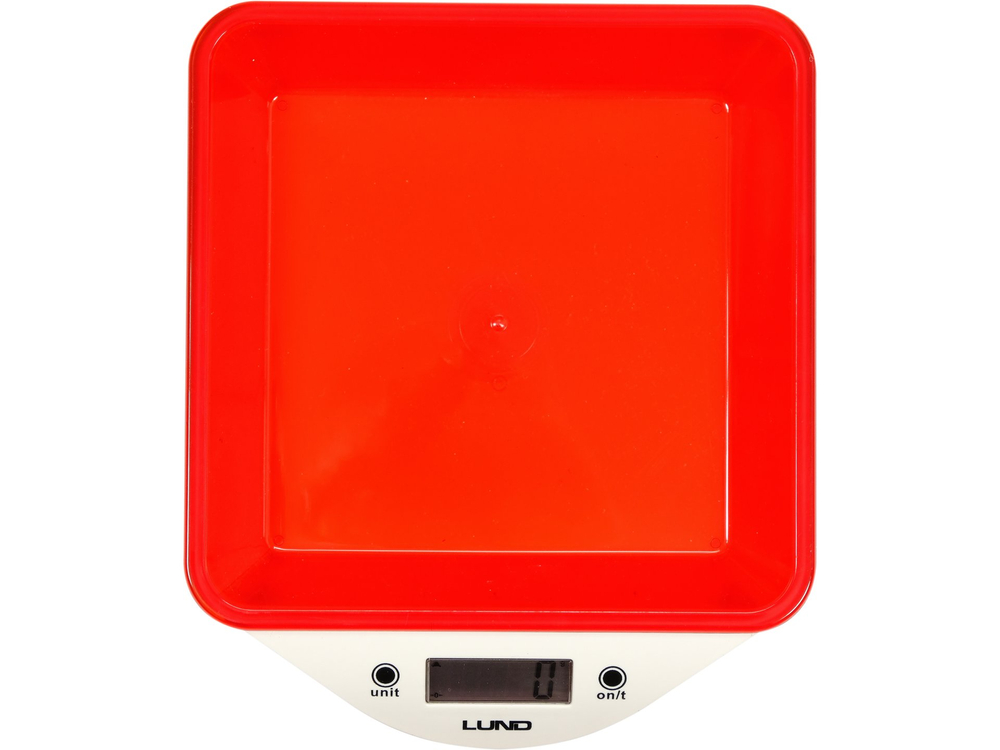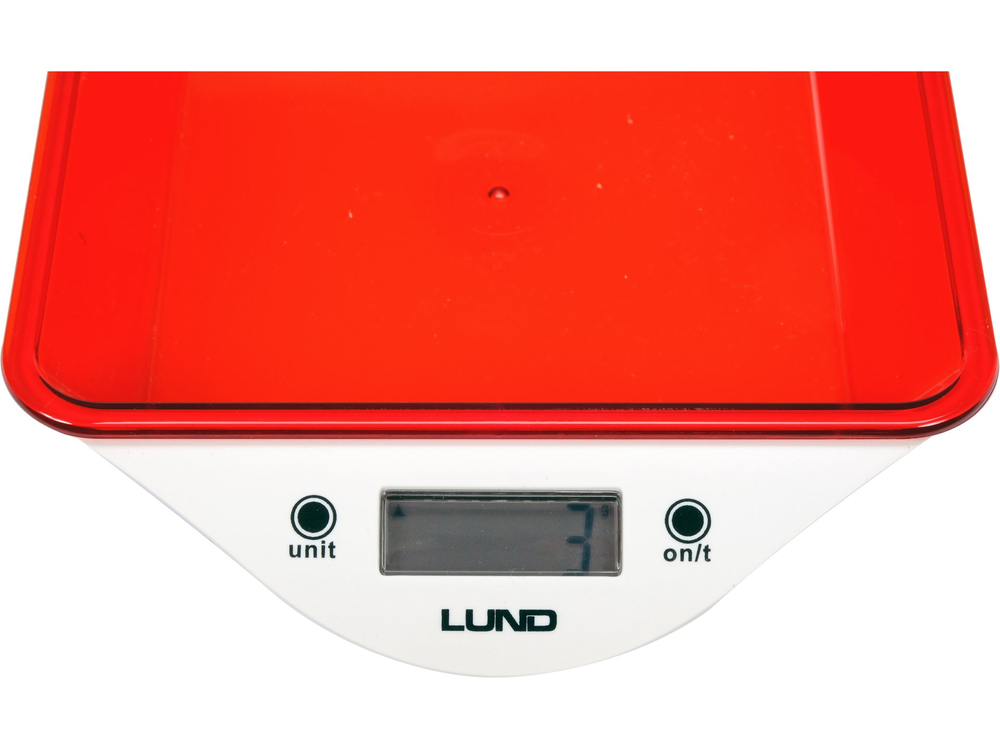 Waga kuchenna LUND z misą o całkowitej pojemności 800ml i maksymalnym obciążeniu 5000g. Wyposażona w czytelny wyświetlacz LCD pokazujący 4 jednostki wagi do wyboru oraz wskaźniki przeciążenia i niskiego poziomu baterii. Dodatkowym atutem jest możliwość wyjęcia i mycia misy w zmywarce.