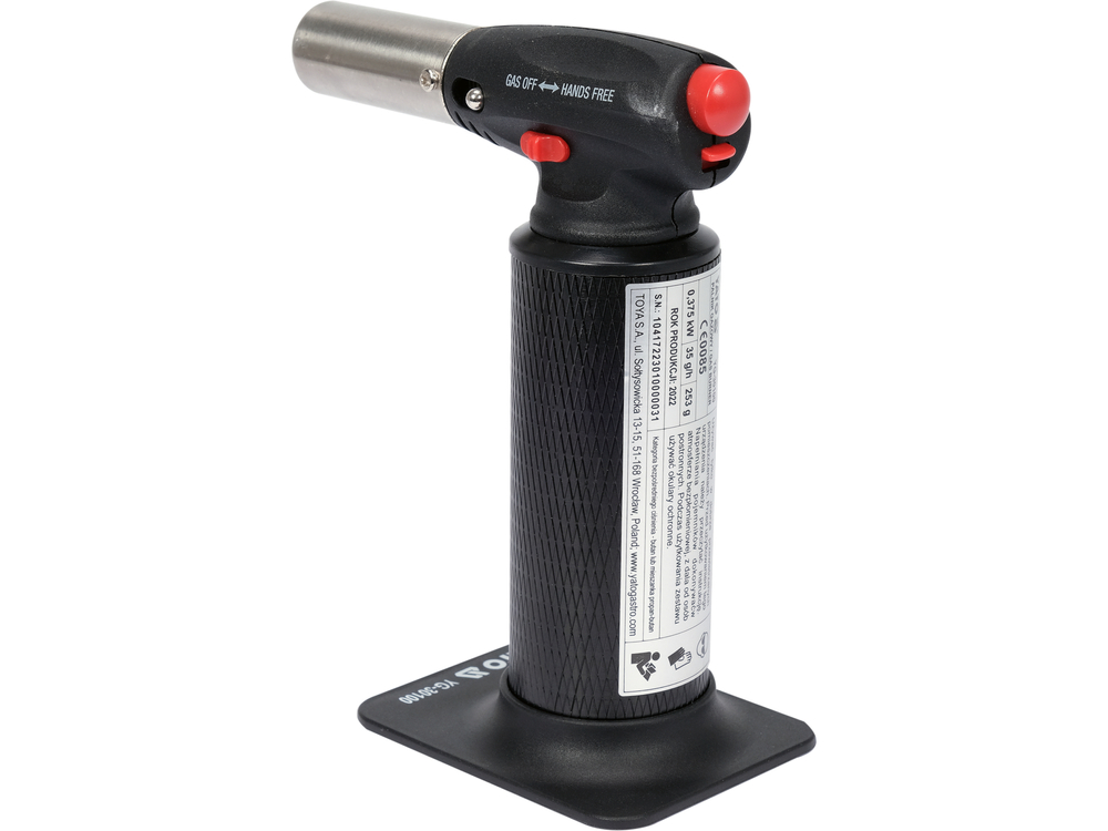 Palnik gazowy z zapłonem piezo, zasilany gazem zapalniczkowym. Regulacja mocy płomienia, aluminiowy korpus z antypoślizgową powierzchnią. Palnik pozwala osiągnąć temperaturę 1350°C. Przeznaczony jest do rozpalania kominków, grilli czy pieców. Doskonale sprawdzi się podczas przygotowywania Creme Brulee, flambirowania lub podpiekania mięs, steków i warzyw. Stanowi świetne rozwiązanie dla każdej cukierni, piekarni czy kawiarni. W pełni napełniony zbiornik pozwala na pracę 90-120 min.