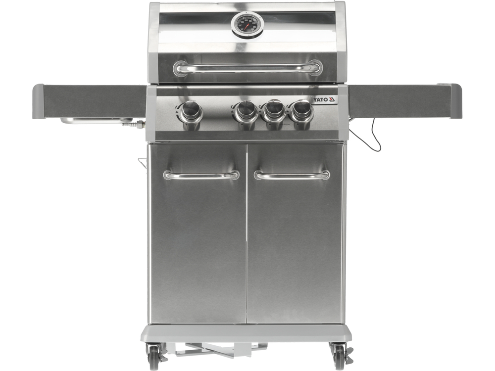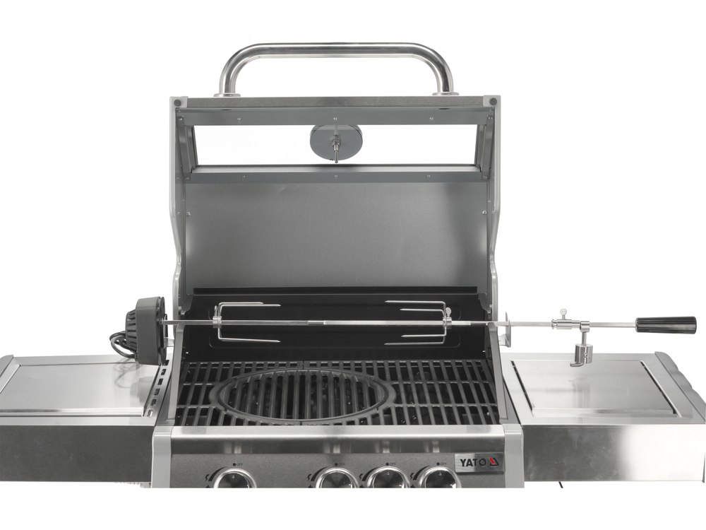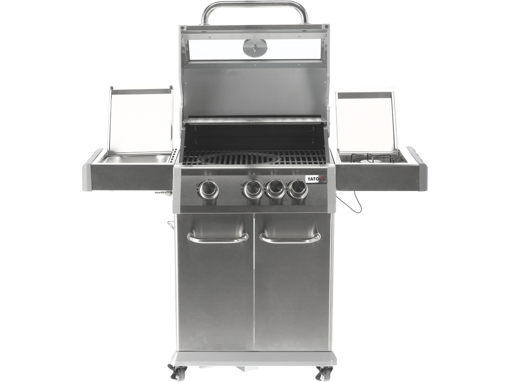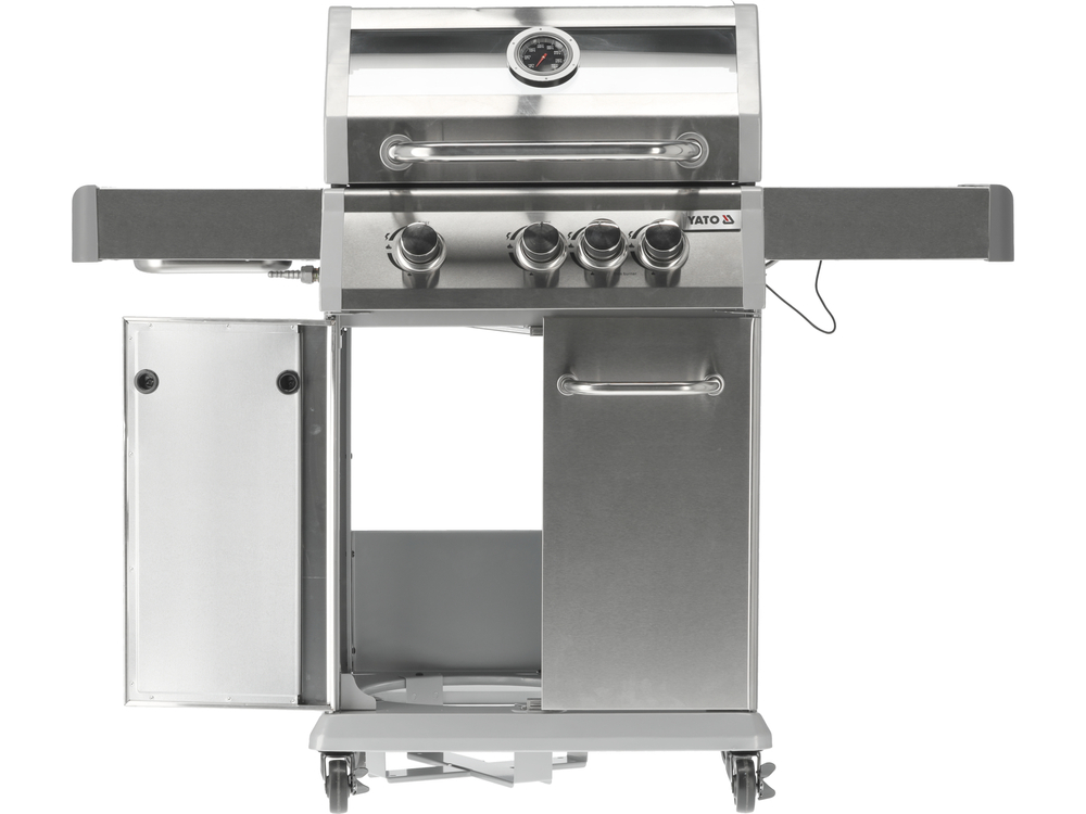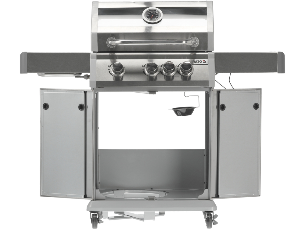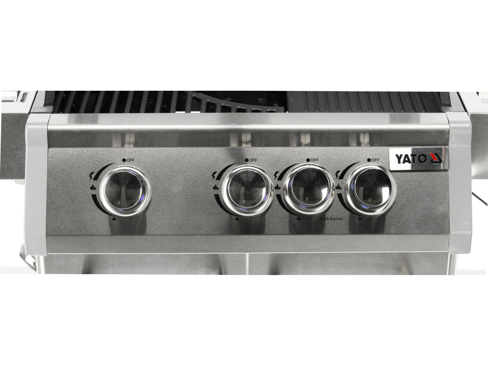 Grill gazowy Yato Itami 3+1 o nowoczesnej stylistyce wykonany ze stali nierdzewnej, wyposażony w żeliwny ruszt o powierzchni 60 x 41,5 cm. Półki boczne oraz pojemna, zamykana szafka ułatwiają przechowywanie niezbędnych akcesoriów. Palnik boczny o mocy 2,2 kW umożliwi gotowanie i podgrzewanie potraw w garnku lub na patelni. Dodatkowym atutem jest miejsce na butlę gazową, pojemnik ze stali nierdzewnej umieszczony w jednej z półek bocznych oraz wbudowany otwieracz do butelek.