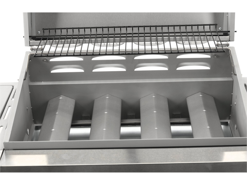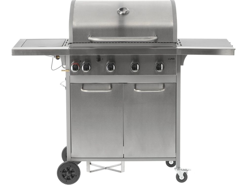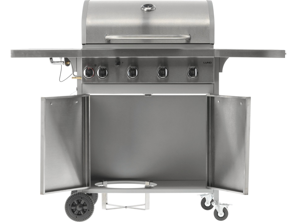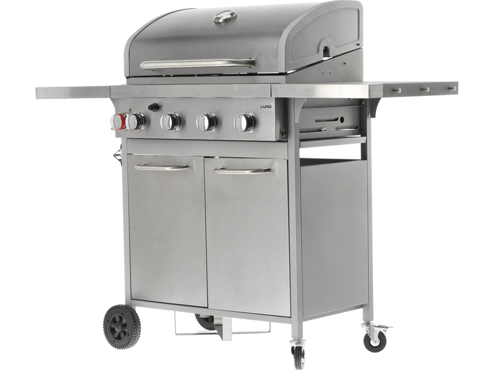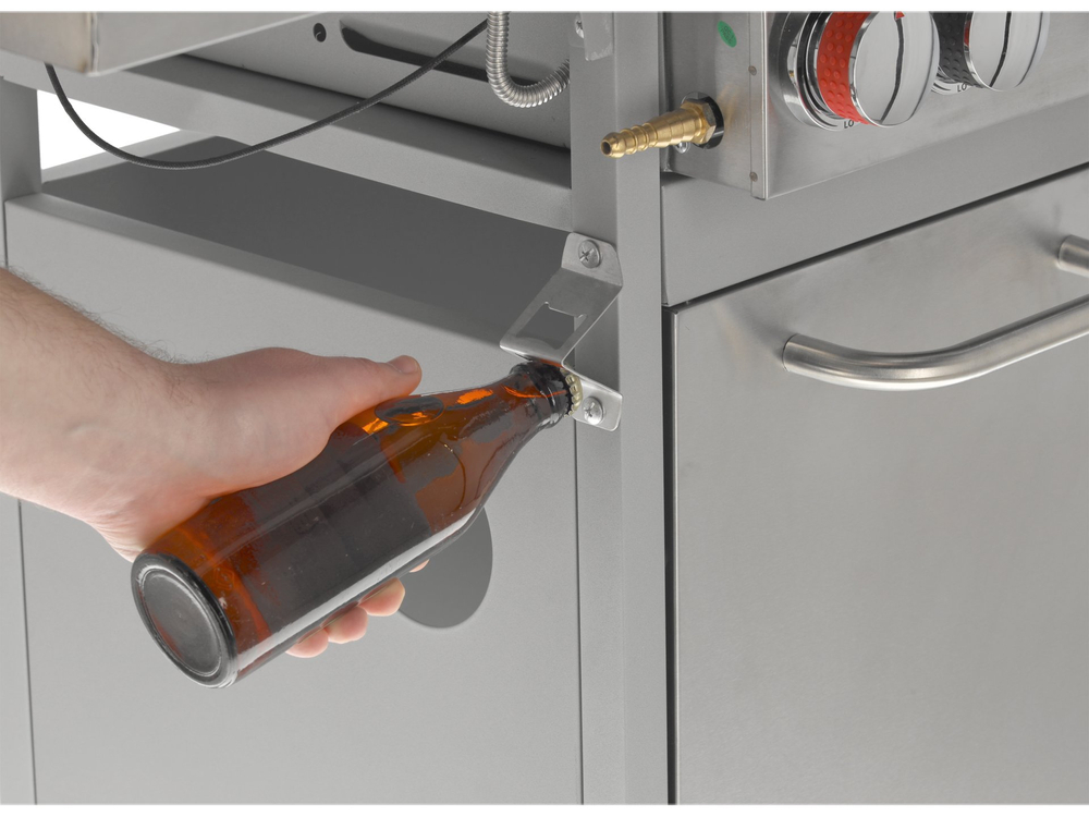 Grill gazowy 3+1 do przygotowywania potraw na świeżym powietrzu. Wykonany ze stali nierdzewnej, wyposażony w niezawodny, żeliwny ruszt. Półki boczne oraz pojemna, zamykana szafka ułatwią przechowywanie przypraw i niezbędnych akcesoriów. Palnik boczny o mocy 3,2 kW umożliwi gotowanie i podgrzewanie potraw w garnku lub na patelni. Dodatkowym atutem jest miejsce na butlę gazową 11kg, wysuwana płyta ściekowa oraz wbudowany otwieracz do butelek.