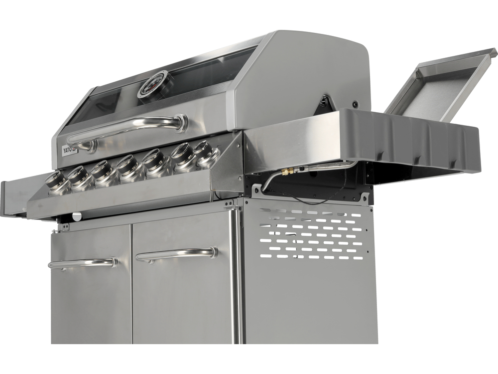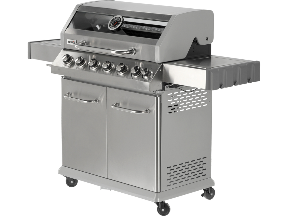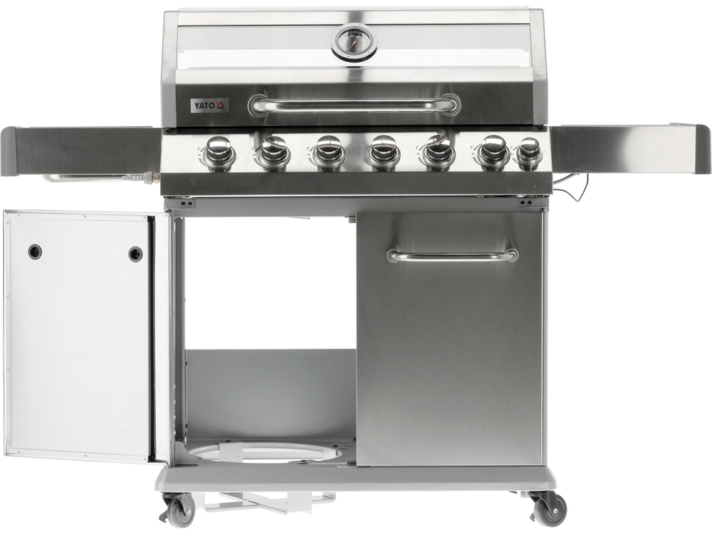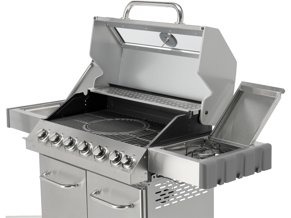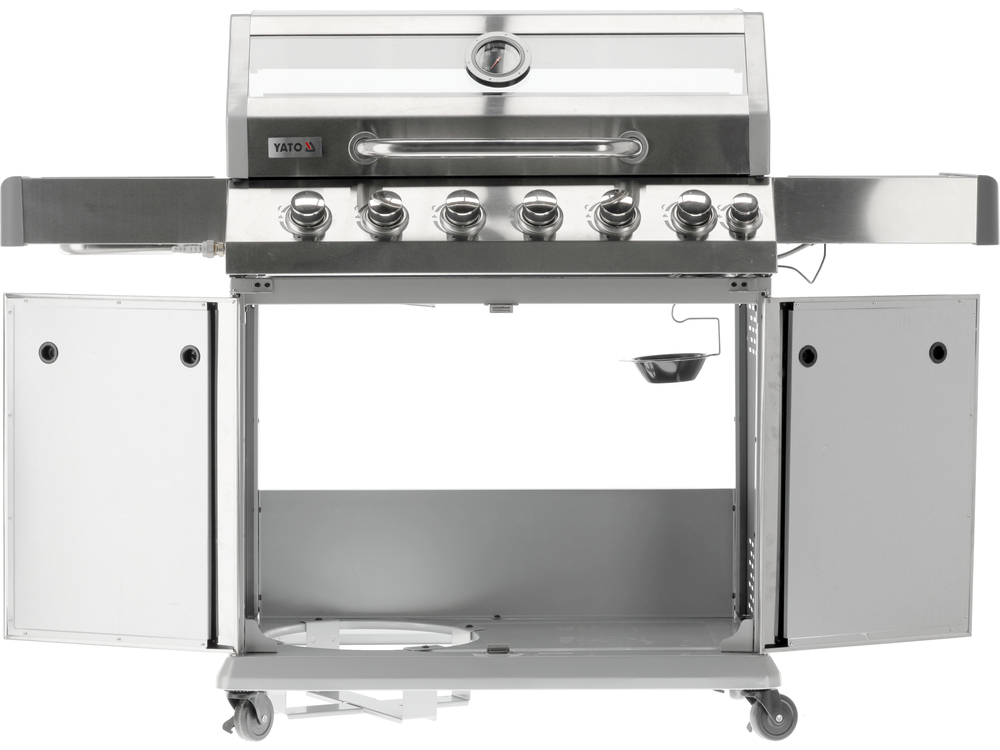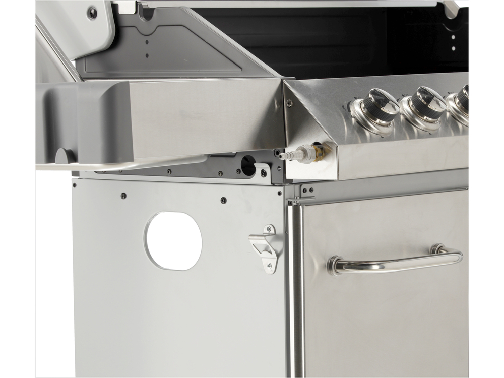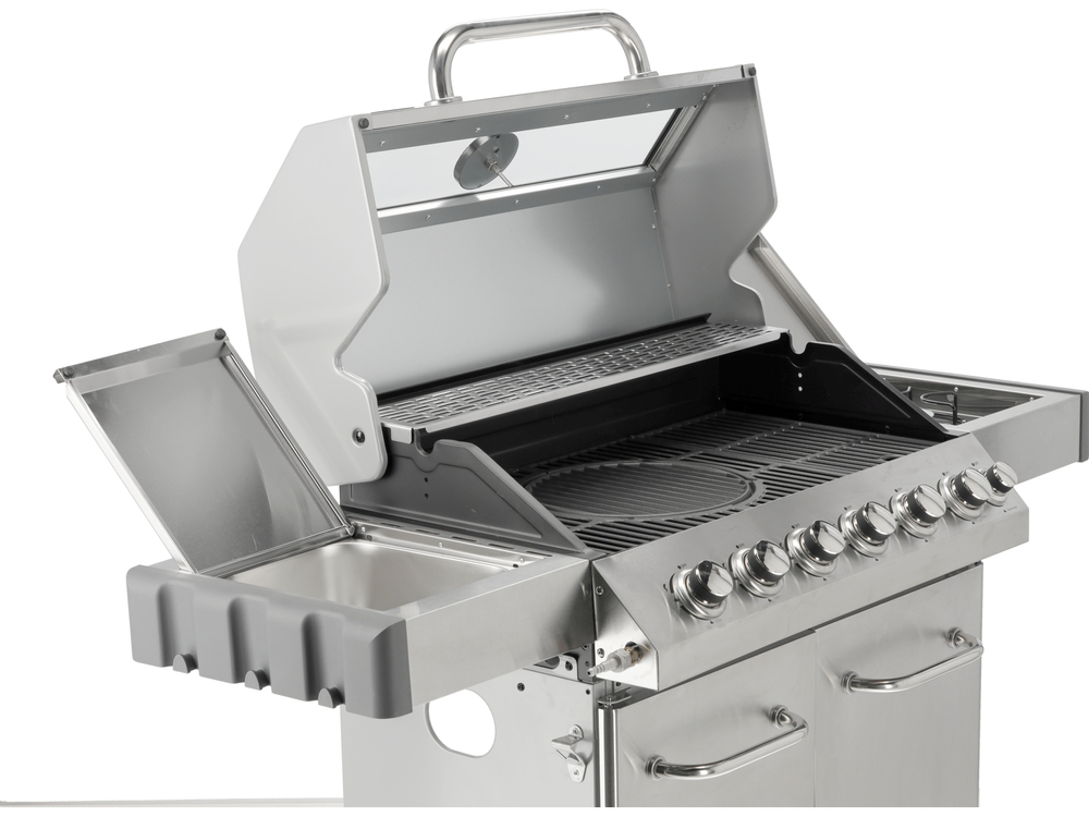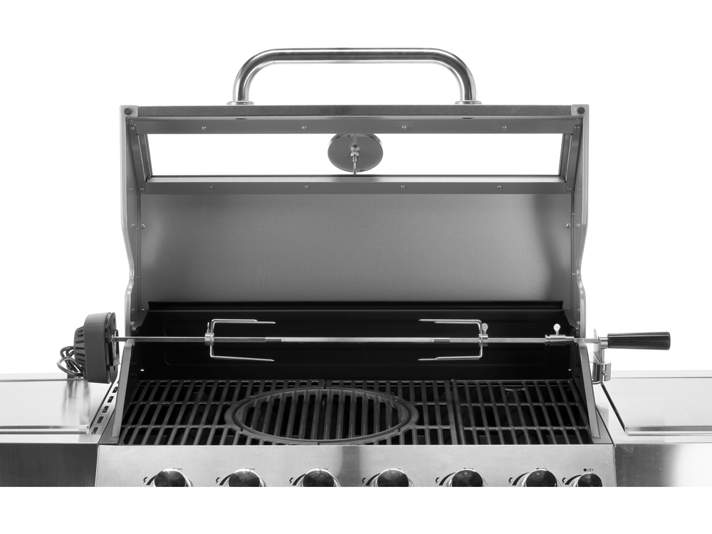 Grill gazowy 6+1 o nowoczesnym wyglądzie wykonany ze stali nierdzewnej, wyposażony w żeliwny ruszt o wymiarach 82 x 41,5 cm. Półki boczne oraz pojemna, zamykana szafka ułatwią przechowywanie przypraw i niezbędnych akcesoriów. Palnik boczny o mocy 2,2 kW umożliwi gotowanie i podgrzewanie potraw w garnku lub na patelni. Dodatkowym atutem jest miejsce na butlę gazową, pojemnik ze stali nierdzewnej umieszczony w jednej z półek bocznych oraz wbudowany otwieracz do butelek.