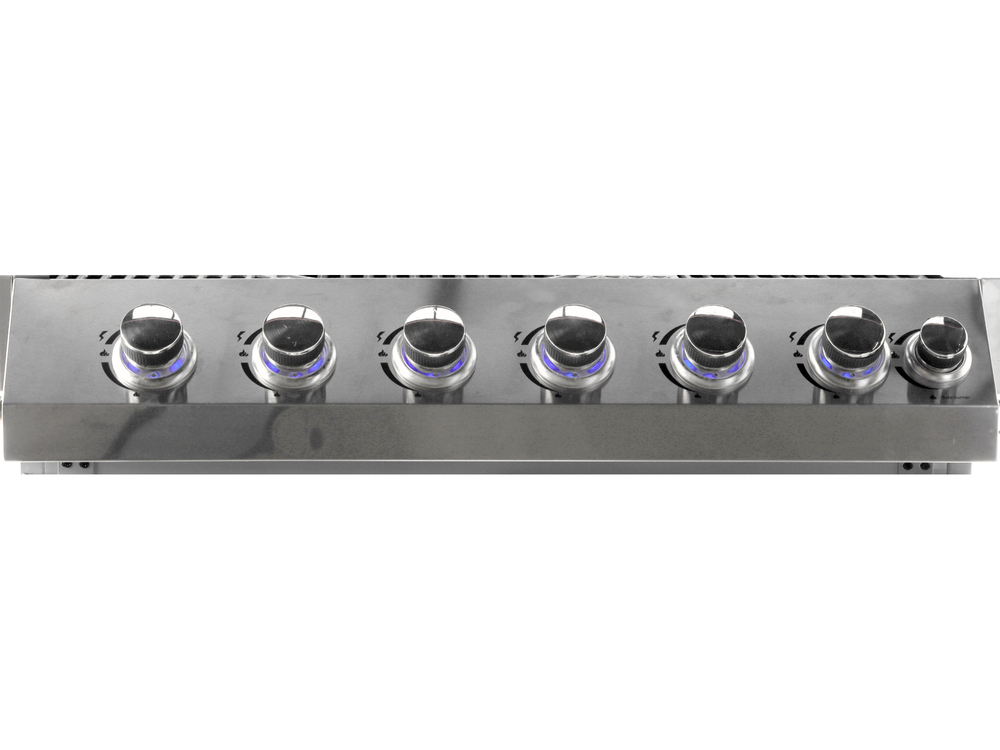 - 7 pokręteł z niebieskim światłem LED, które zapalają się po uruchomieniu danego palnika. Oświetlenie ułatwią grillowanie po zmroku, informuje który palnik jest włączony