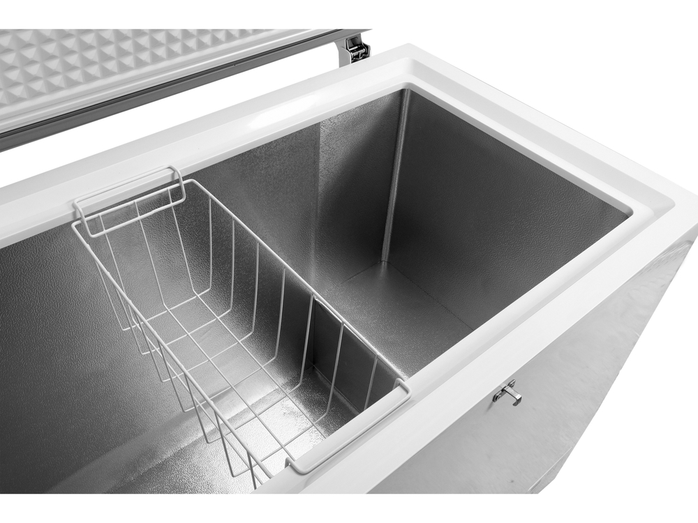 Zamrażarka skrzyniowa dla gastronomii profesjonalnej. Posiada samozamykające drzwi uchylne z uchwytem, wyposażone w zamek.