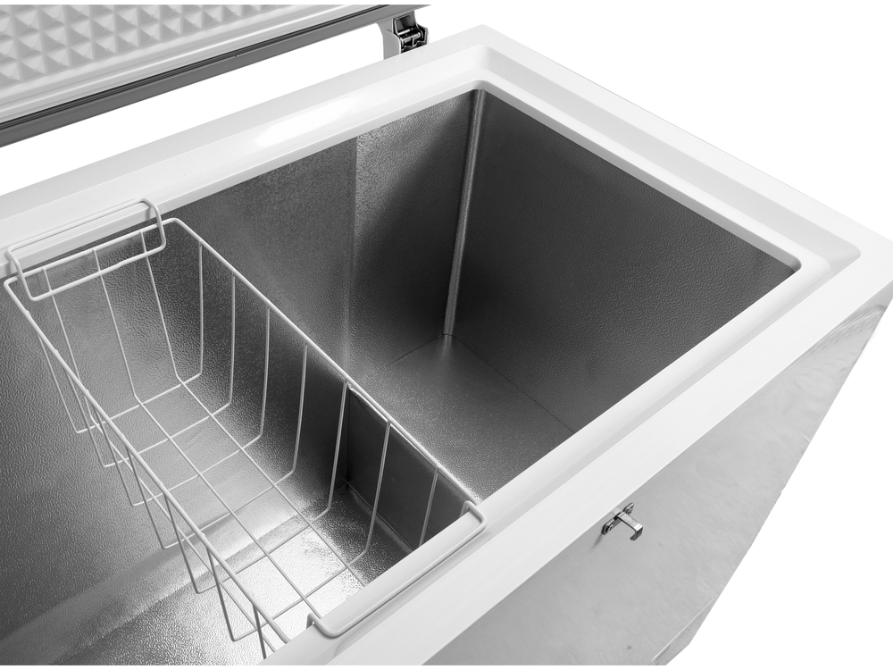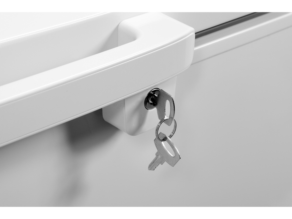 Zamrażarka skrzyniowa dla gastronomii profesjonalnej. Posiada samozamykające drzwi uchylne z uchwytem, wyposażone w zamek.