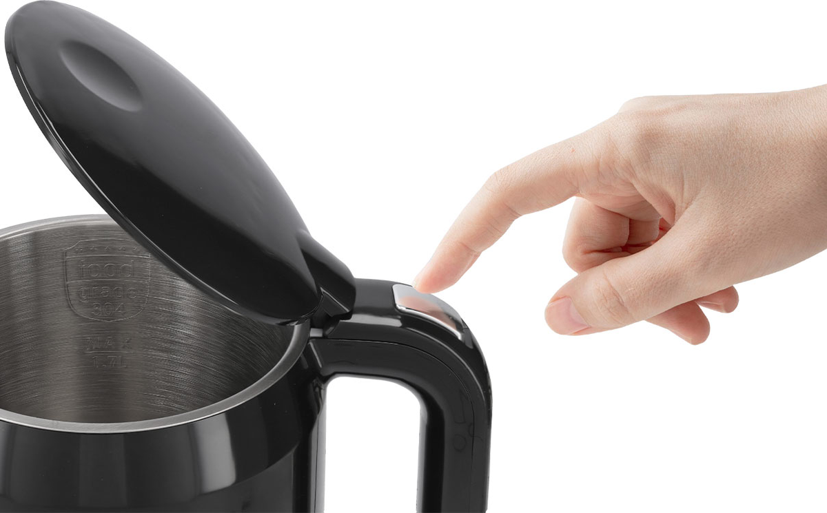Urządzenie posiada wygodny system otwierania pokrywki za pomocą przycisku w uchwycie oraz szeroki wlew, ułatwiający napełnianie wodą.
