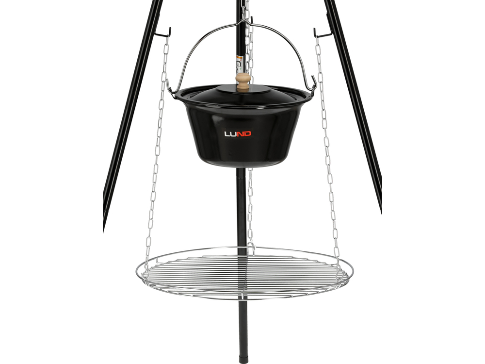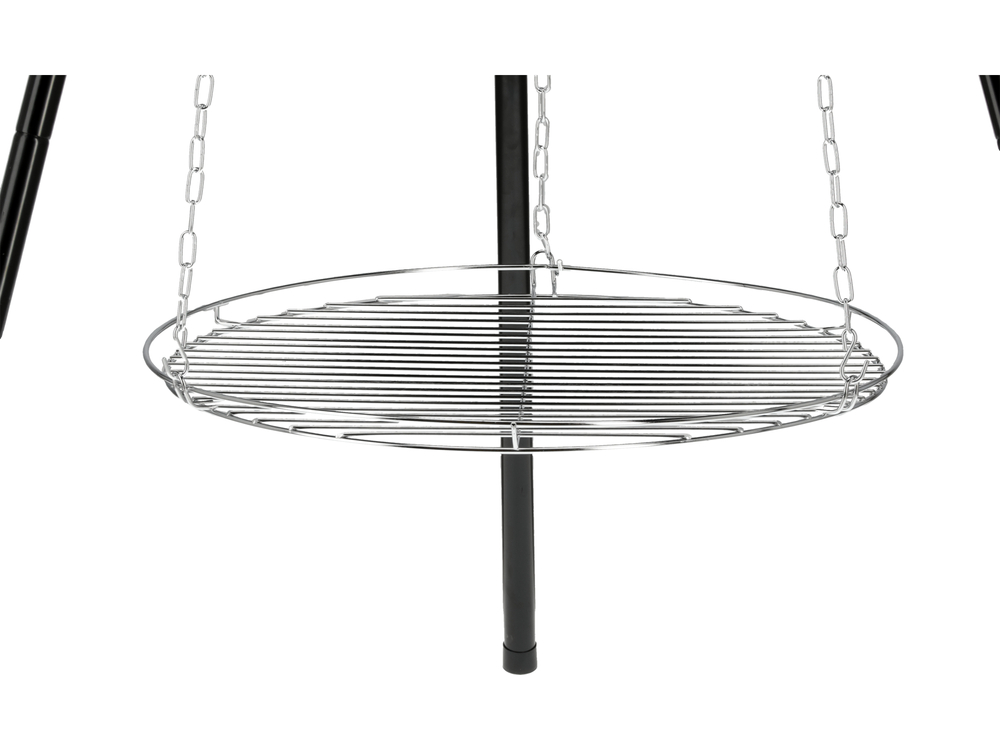• chromowany ruszt jest lekki, wtrzymały, łatwo się czyści i zapewnia długie użytkowanie. Dodatkowo ruszt ma wysokie ranty zapobiegające spadaniu jedzenia. Możliwość zawieszenia rusztu na 2 sposoby – do regulowanego łańcucha lub do trójnogu