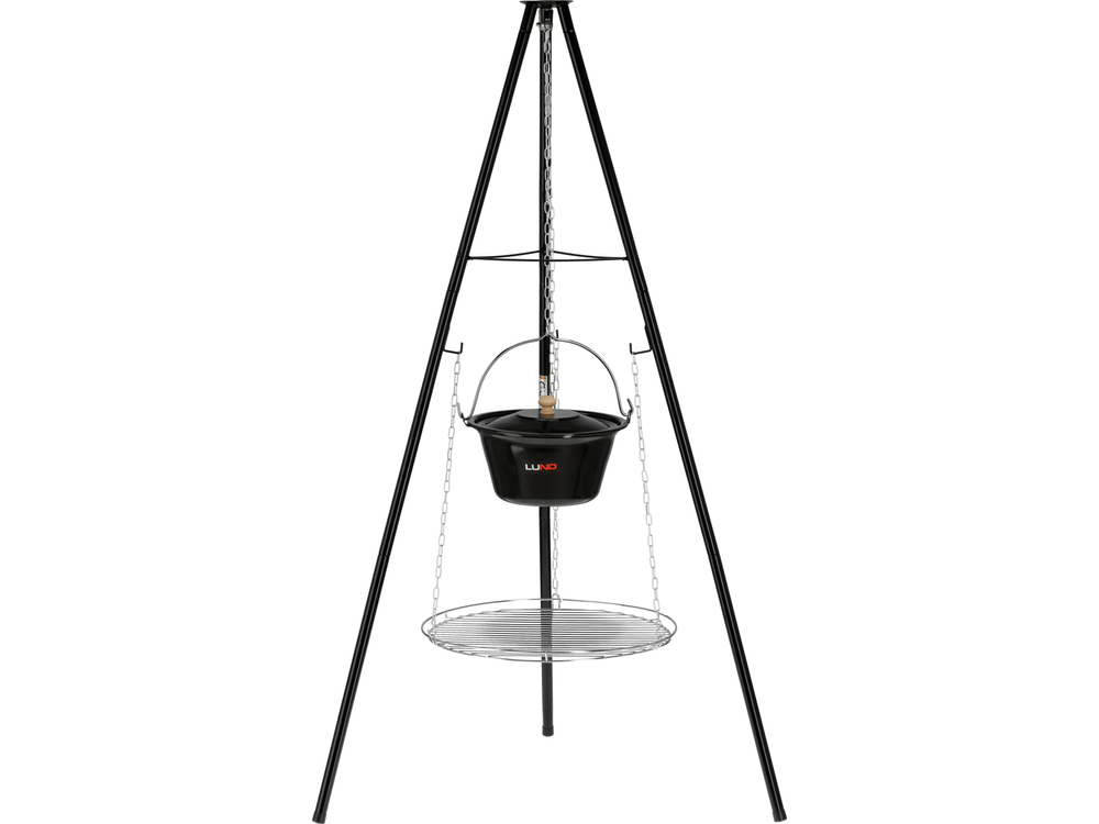 Przenośny grill węglowy na trójnogu z rusztem i kociołkiem zamykanym pokrywą. Dwie opcje podgrzewania pozwalają przygotować różne rodzaje potraw w tym samym czasie lub osobno.