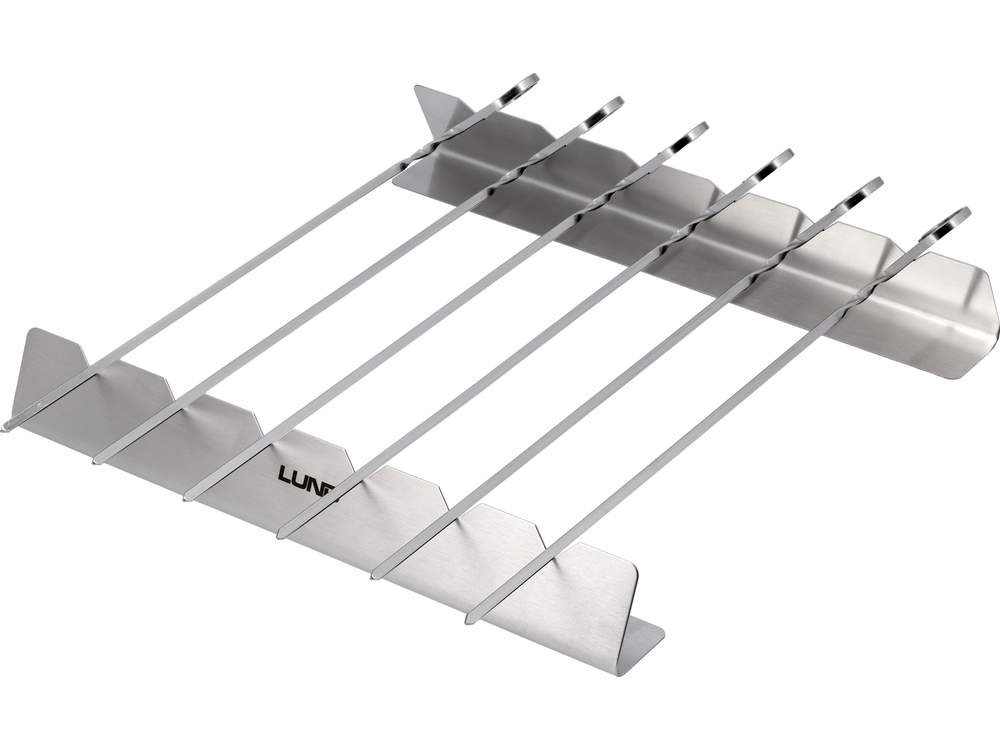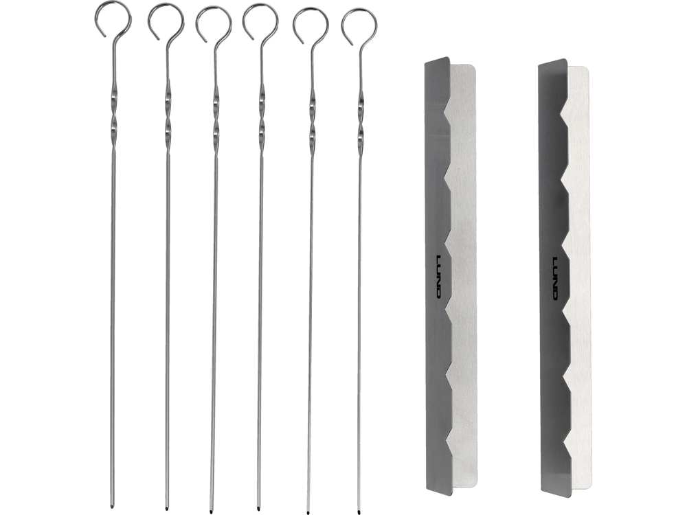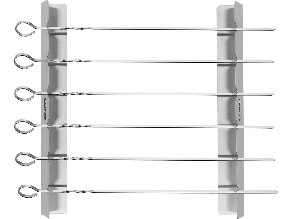 6 stalowych szpikulców do nabijania składników na szaszłyki ze stabilną podstawą do wygodnego odkładania i obracania żywności.