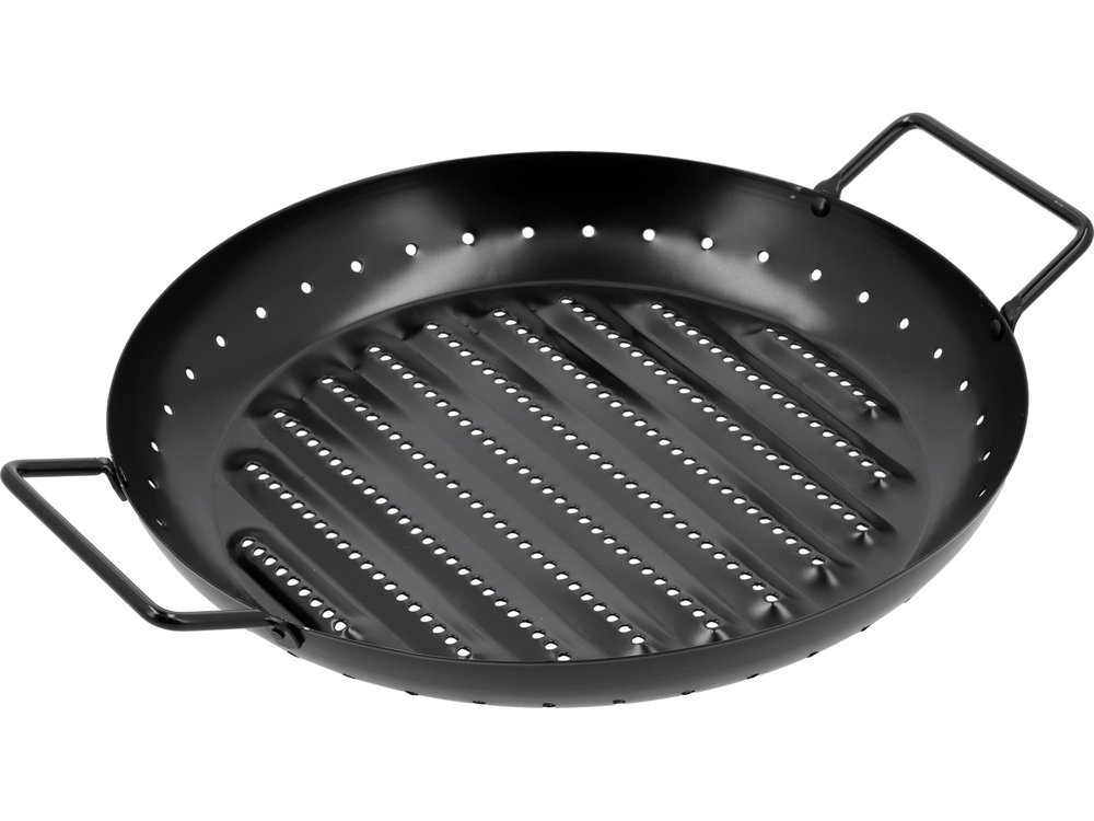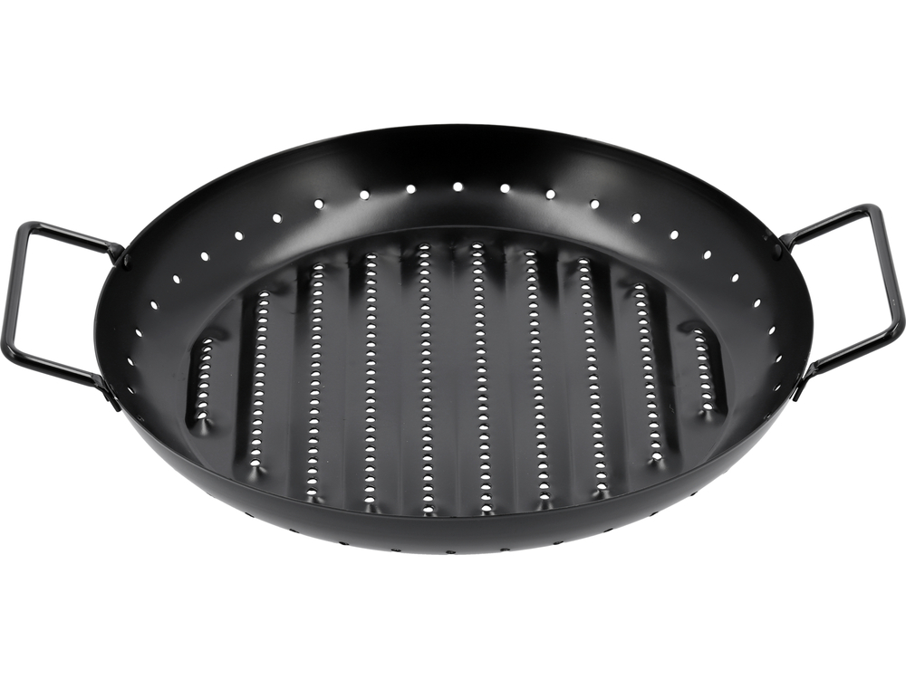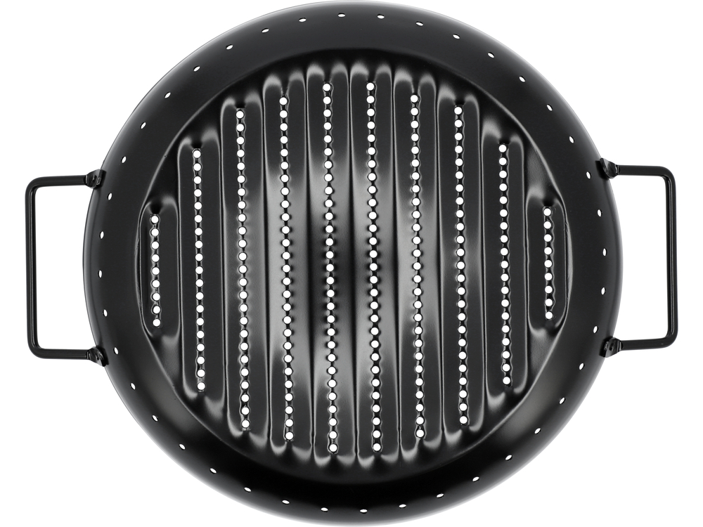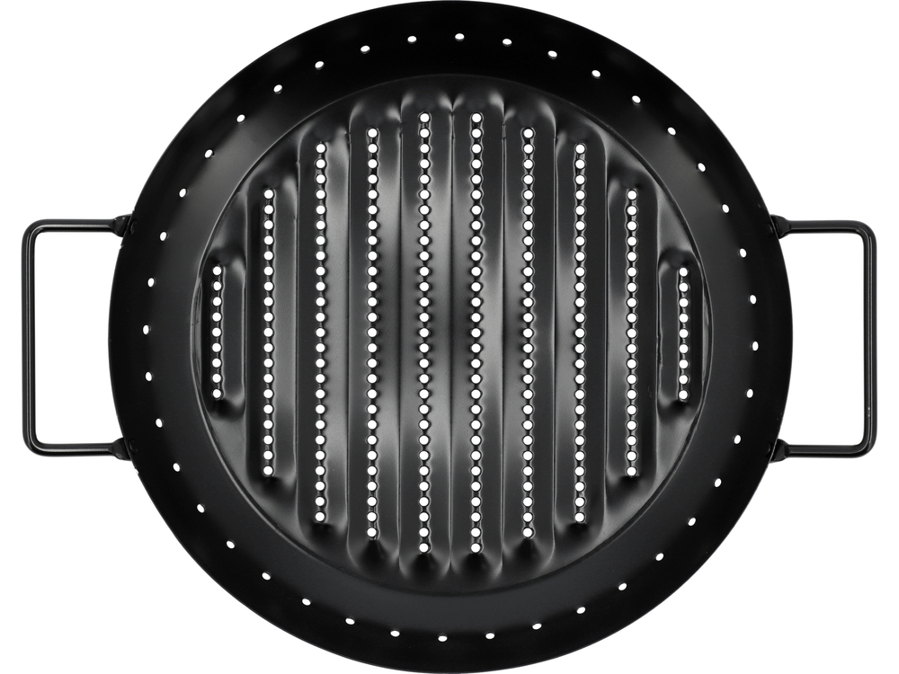 - liczne otwory w podstawie i po boku zapewniają lepszą cyrkulację ciepła i dymu oraz efektywniej odprowadzają nadmiar tłuszczu