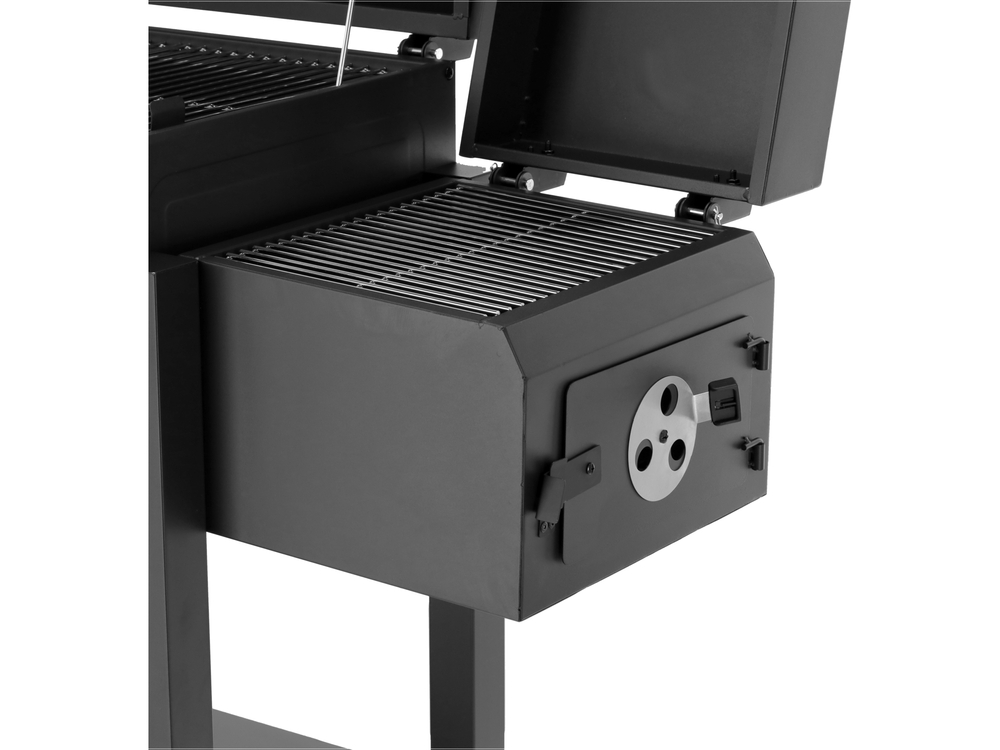 • boczna komora (palenisko): miejsce, gdzie rozpalasz ogień i dokładzasz drewno/węgiel – dym stąd przechodzi do głównej komory