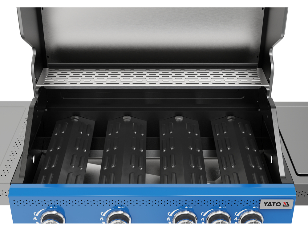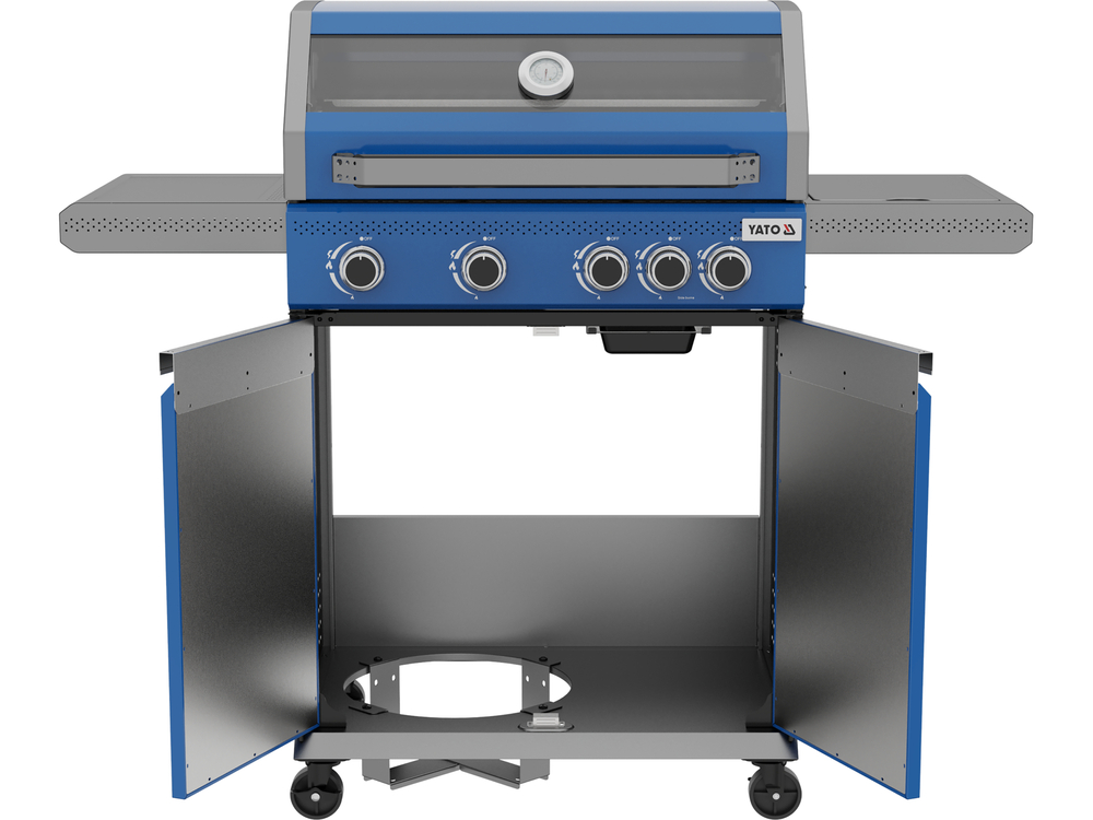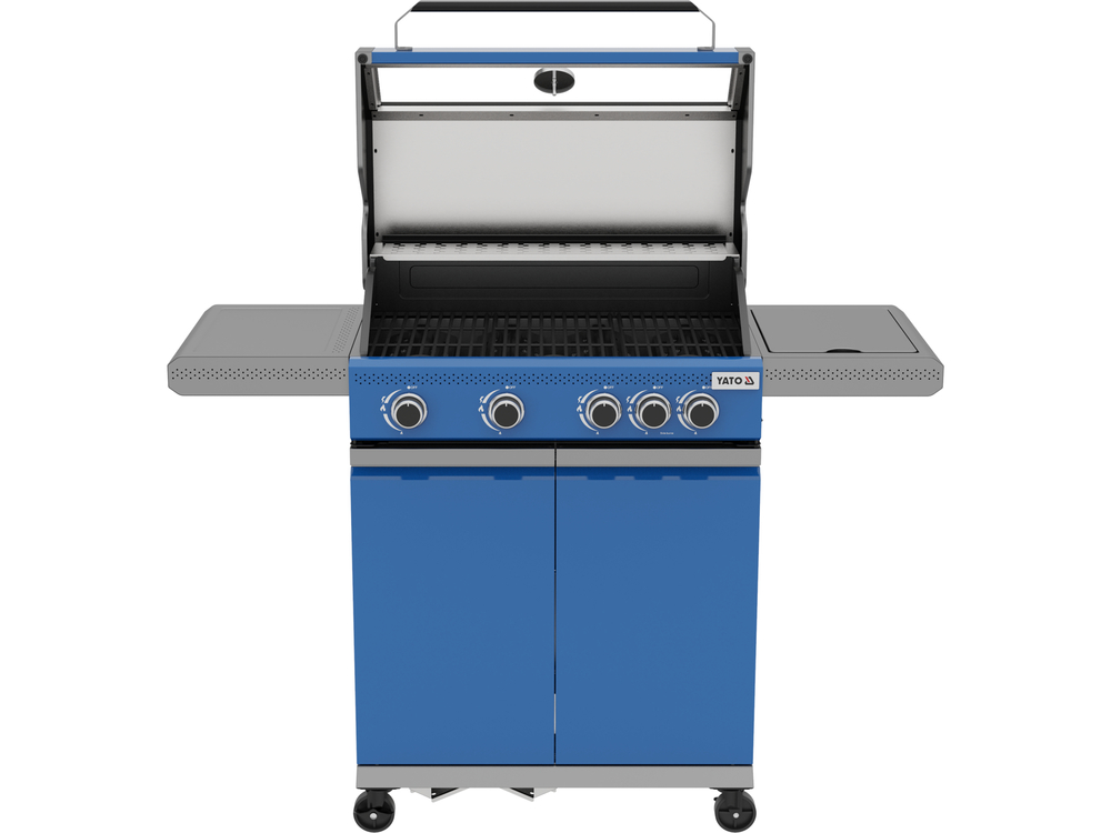 Nowoczesny grill gazowy 4 + 1 z serii YATO Itami w unikalnym niebieskim kolorze. Wyposażony w niezawodny, żeliwny ruszt o powierzchni 68 x 42 cm oraz kratkę podgrzewającą ze stali nierdzewnej. Łączna moc palników wynosi 14,2 kW. Półki boczne oraz pojemna, zamykana szafka ułatwiają przechowywanie przypraw i niezbędnych akcesoriów.