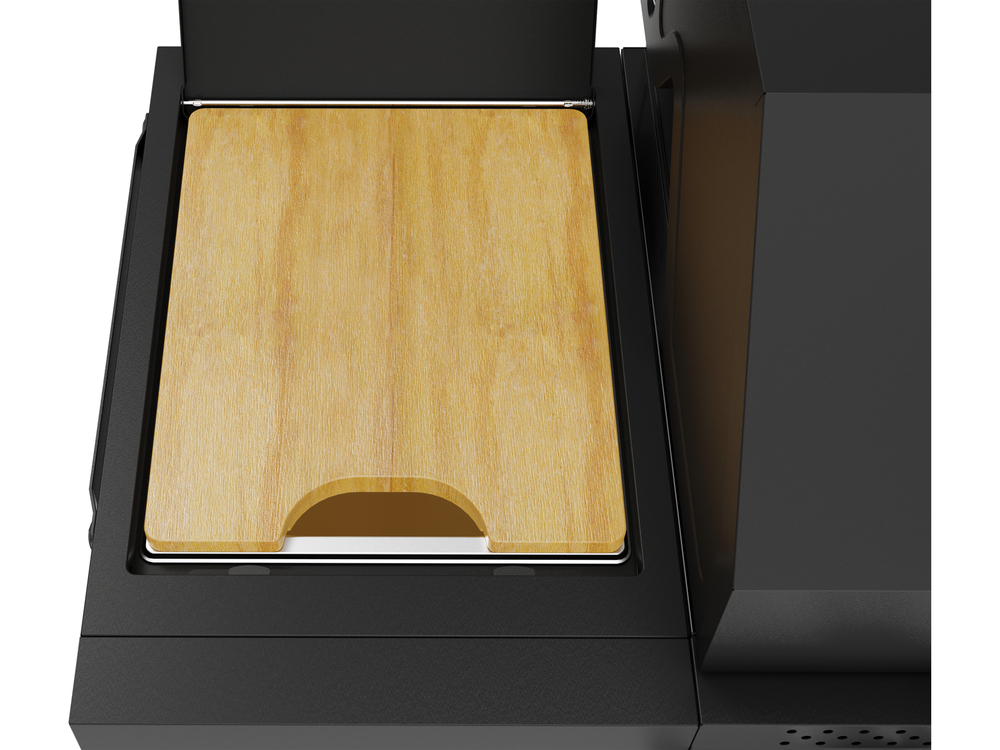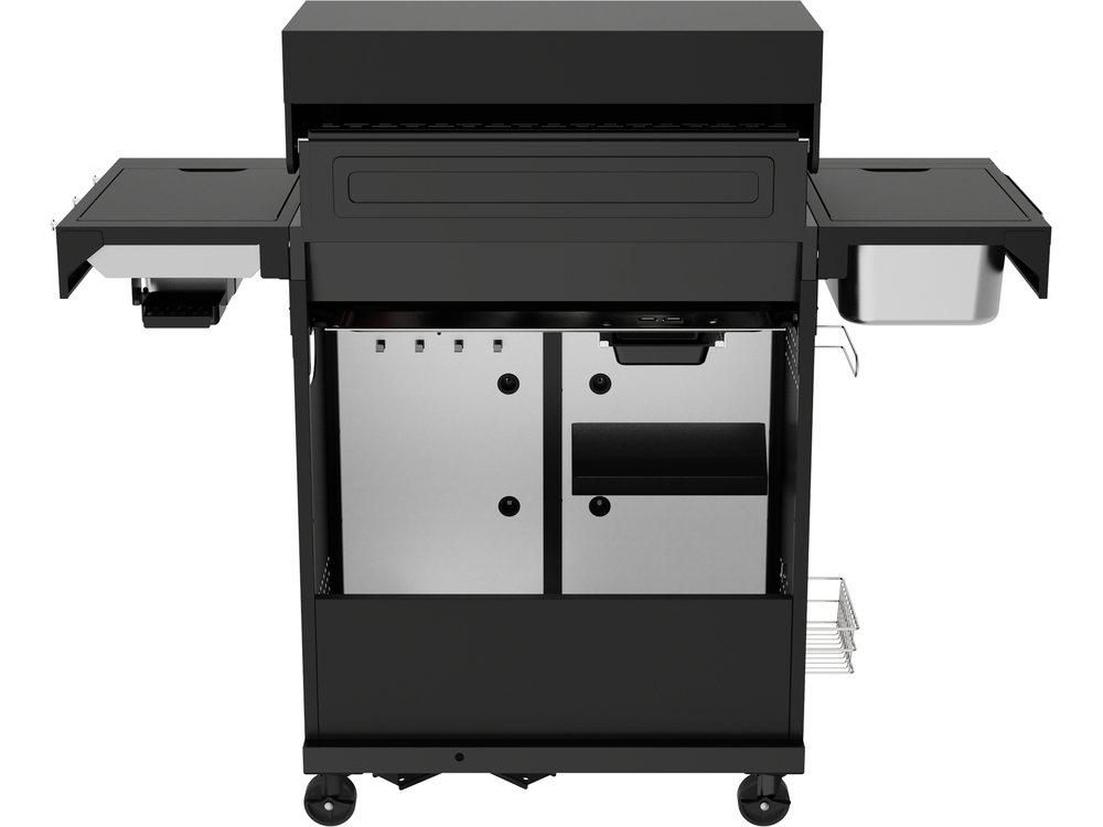 - Półka boczna wyposażona jest w wyciąganą drewnianą deskę do krojenia, która ułatwia przygotowanie potraw. Dodatkowo stalowy pojemnik (stal nierdzewna) pozwala na wygodne przechowywanie składników lub gotowych dań tuż przy grillu. Możliwość wyjęcia pojemnika za pomocą 2 uchwytów